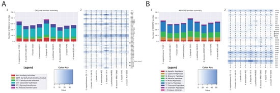 Comparative genomic analyses of Cordycipitaceae fungi. (A) Carbohydrate-active enzymes (CAZymes) and (B) proteases (MEROPS). Each category with a standard deviation > 1 was plotted in the heat map. Asterisks represent the more prominent changes in Parengyodontium lineage in both CAZy and MEROPS classes. The numerical number “1” represents for the major families shown in bar plot and “2” depicts the significantly enriched or depleted functional traits.