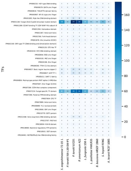 We also compared the profile of fungal-specific transcriptional factors among the Cordycipitaceae species (Figure 6). In general, we observed the enrichment of certain classes of transcriptional factors in the Parengyodontium lineage compared to other fungi. For example, the classes KilA-N domain (IPR018004), Basic region leucine zipper 2 (IPR004827), Helix-loop-helix DNA-binding domain (IPR011598), Myb-like DNA-binding domain (IPR001005), bZIP TF 1 (IPR004827), Fungal Zn(2)-Cys(6) binuclear cluster domain (IPR001138) and Fungal-specific TF domain (IPR007219) are enriched in this particular Cordycipitaceae group. It is worth noting that such enrichments are more prominent in P. torokii LEC01 and P. americanum AZ2 compared to P. torokii FJII-L10-SW-P1.