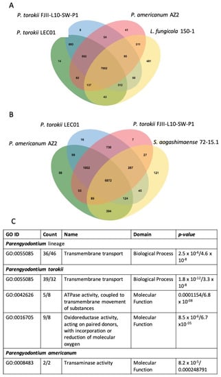 GO-enrichment of the Parengyodontium lineage. The Venn diagram shows shared orthologs and unique groups of genes of the Parengyodontium species using either Lecanicillium fungicola 150-1 (A) or Simplicillium aogashimaense 72-15.1 (B) as outer species for comparisons. (C) The GO categories shared in both scenarios enriched for either Parengyodontium sp., Parengyodontium torokii, or Parengyodontium americanum are listed with its respective function, domain, number of counts, and associated p-value.