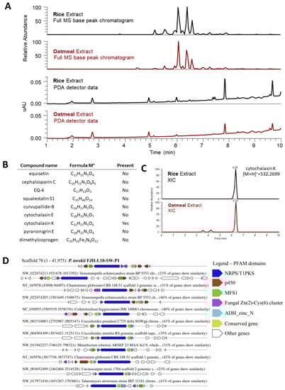 To access the metabolic profile of the P. torokii FJII-L10-SW-P1, the fungal extracts that were generated from samples grown separately on rice and oatmeal media were analyzed by LC–MS to verify similarities between the identified gene clusters predicted by in silico genomic analysis and the fungal metabolite production of the fungus. The two extracts showed similarities in their metabolite production based on their based peak chromatogram and photodiode array detector data collected from the LC-MS analysis (Figure 8A–C). The extracted-ion chromatograms (XIC) were used to identify compounds that have previously been described by the same biosynthetic gene clusters (Figure 8C). We found that cytochalasin K was putatively biosynthesized by this fungus under these growth conditions (Figure 8B), as the accurate mass of cytochalasin K was found in both extracts within 5 ppm of the compound’s accurate mass value (m/z 532.2708 [M+H]+; calcd for C32H38NO6, m/z 532.26991; Figure 8C). This biosynthetic cluster was also identified by in silico analysis and is conserved among other Pezizomycotina fungi (Figure 8D). In addition, we identified 32 secondary metabolite clusters predicted by antiSMASH (Table S6). From those, we identified a putative cluster related to the production of equisetin, cephalosporin C, EQ-4, squalestatin S1, curvupallide-B, pyranonigrin E, and dimethylcoprogen (Table S6). In addition, using a metabolite identification protocol and an in-house database of over 650 fungal metabolites [,], we also note the level one identification [] of the following metabolites: 5,8-Epidioxyergosta-6,9(11),22-trien-3-ol, cephalochromin, (E)-2,3-dihydroxypropyl octadec-6-enoate, cyclo(L-Leu-L-Pro), betulinan, 6,9-Octadecadienoic acid, ergosta-4,6,8(14),22-tetraen-3-ol, and (3β,22E)-cyclo (L-Pro-L-Leu) (Table S7).