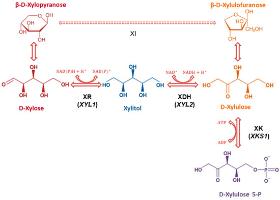 Lignocellulosic biomass is composed of cellulose (a linear polymer of glucose molecules linked by β-1,4 glycosidic bounds), hemicellulose (a branched and highly heterogeneous polymer containing both hexoses and pentoses) and lignin. Thus, the resulting biomass hydrolysates have various hexoses and pentoses available, and after glucose, xylose and arabinose are the second and third most abundant sugars in most plant biomass hydrolysates [9,10]. While glucose can be easily fermented by industrial Saccharomyces cerevisiae strains [11], this yeast is not naturally able to ferment the pentoses, xylose and arabinose, unless it is genetically modified to express the assimilation routes for these sugars [12,13,14]. In the case of xylose (Figure 1), genes encoding for xylose reductase (XR) and xylitol dehydrogenase (XDH) from Scheffersomyces stipitis or Spathaspora passalidarum, or xylose isomerase (XI) from bacteria and fungi, have been extensively used [14,15,16,17,18]. Since both pathways transform xylose into xylulose (Figure 1), it is also necessary to overexpress the endogenous xylulokinase (XK) gene that will enhance the entrance of this sugar into the pentose phosphate pathway. While the XI pathway can provide higher ethanol yields, the XR/XDH route allows higher ethanol productivities and higher xylose consumption rates by engineered S. cerevisiae yeasts [19,20].
