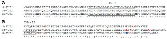 Sequence alignment of the N-terminal (A) and C-terminal (B) cytoplasmic domains of the SsXUT1, SpXUT1 and SaXUT1 transporters. The protein sequences were aligned using Clustal Omega [55]; the transmembrane α-helices (underlined residues) were predicted with the PRALINE program [56], and the lysine residues with medium (blue) or high (red) ubiquitinylation potential were determined with the UbPred program [58].