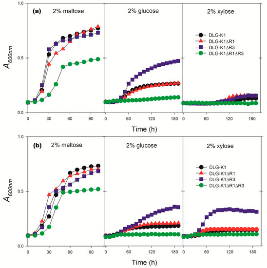 To verify the influence of these two α–arrestins on the functional expression of the SpXUT1 and SaXUT1 permeases in S. cerevisiae, we constructed, in our hxt-null DLG-K1 chassis (Table 1), knockout mutants in ROD1 (DLG-K1∆R1), ROG3 (DLG-K1∆R3) or both ROD1 and ROG3 (DLG-K1∆R1∆R3). Figure 6 shows the growth patterns of these three strains, transformed with plasmids pGPD-SaXUT1 or pPGK-SpXUT1, in three carbon sources: maltose, glucose and xylose. Analyzing the data, it is evident that the deletion of both α-arrestins (rod1Δ, rog3Δ) has a negative impact on growth, even with the control carbon source (2% maltose). While DLG-K1 and single α-arrestin mutants produced 8–9 g ethanol/L (Table 3), strain DLG-K1∆R1∆R3 transformed with both plasmids produced less ethanol (6–8 g/L) from 2% maltose. Knockout of both genes not only did not improve the results when the cells were grown in the other two carbon sources, but in fact it had a negative impact on the performance of the hxt-null strains expressing either of the XUT1 permeases (Figure 6).