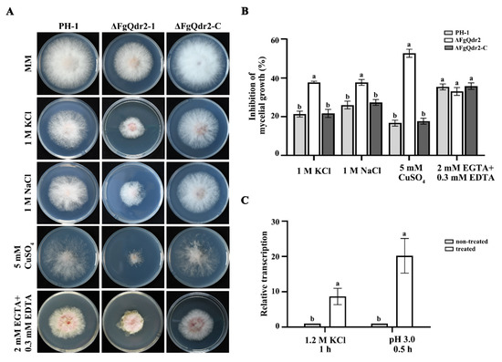 FgQdr2 is involved in the transport of potassium, sodium, and copper, as well as the regulation of membrane proton gradient. (A) Sensitivity of each strain to the corresponding stress agents. ΔFgQdr2 exhibited increased sensitivity to K+ Na+, Cu2+ osmotic stresses, and displayed similar sensitivity to the divalent cation chelator ethylene diamine tetra-acetic acid (EDTA), compared with the wild type. Each strain was cultured on MM, with or without the corresponding stress agents. The images were taken after 3 d incubation at 25 °C, and the mycelial growth inhibition was calculated for each strain. (B) The mycelial growth inhibition of each strain under the above drug treatments. (C) The qRT-PCR revealed that the transcription level of FgQDR2 was increased under K+ and H+ inductions. The stain was first cultured in yeast extract peptone dextrose (YEPD) for 24 h, then transferred to YEPD supplied with (treated) or without (non-treated) the corresponding ion stress agents. The expression level of FgQDR2 in the non-treated strain was referred to as 1, and the FgACTIN gene was used as the internal control for normalization. For (B,C), mean and standard deviation were estimated with data from three independent biological replicates (n = 3). Different letters indicate significant differences based on ANOVA analysis, followed by Turkey’s multiple comparisons test (p < 0.05).