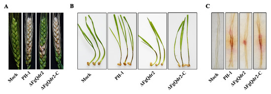FgQdr2 is important for the virulence of F. graminearum. Virulence of each strain on wheat heads (A), coleoptiles (B), and corn silks (C). The mutant ΔFgQdr2 showed significantly reduced virulence on the above wheat tissues. The mock treatments indicate the corresponding host tissues inoculated with sterile water as a negative control.
