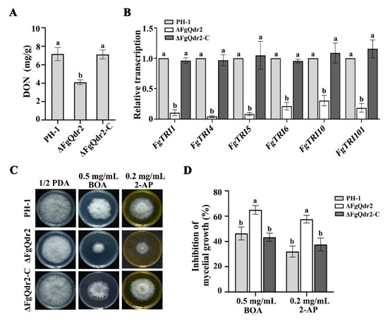 Given that DON is proposed as an important virulence factor in F. graminearum [4,5,6,7,8], and ΔFgQdr2 showed a significant defect in virulence, we then assayed DON biosynthesis in ΔFgQdr2. After cultivation in the TBI medium for 7 d, ΔFgQdr2 was found to produce significantly lower levels of DON than the PH-1 and its complemented strains (Figure 5A). To further confirm the results, the transcription levels of the core DON biosynthetic genes (FgTRIs) [48] was determined using qRT-PCR assays. Accordingly, the expression levels of FgTRI1, FgTRI4, FgTRI5, FgTRI6, FgTRI10, and FgTRI101 in ΔFgQdr2 were dramatically decreased by 89.4%, 95.7%, 91.6%, 78.7%, 69.5%, and 81.5%, respectively, as compared to those in the PH-1 and its complemented strains (Figure 5B). These results suggested that FgQdr2 is involved in the biosynthesis of the virulence factor DON during disease spreading.