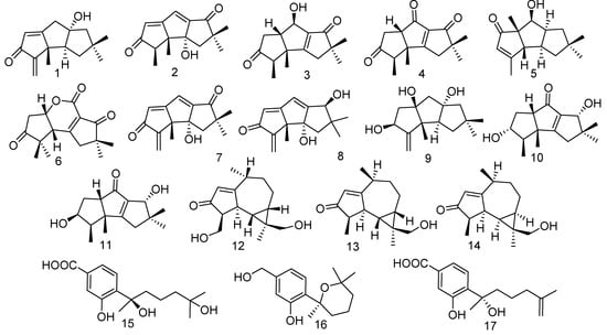 Previous research revealed that approximately 500 new sesquiterpenes, including about 20 new skeletons, were characterized from fungi during a five-year period (2015~2020) [14]. Soft coral-associated fungi are reported to be a rich source of sesquiterpenes. Li et al. have obtained a series of sesquiterpenoids from soft-coral associated fungi. Eleven linear triquinane sesquiterpenoids including chondrosterins A–E (1–5) [15], chondrosterin F (6) and incarnal (7) [16], hirsutanol A (8), [17] hirsutanol E (9), chondrosterin N (10) and chondrosterin O (11) [18] were isolated from the fungus Chondrostereum sp., separated from the soft coral Sarcophyton tortuosum, from the South China Sea. In addition, a new aromadendrane sesquiterpenoid, pseuboydone F (12), was extracted from the fungus Pseudallescheria boydii F44-1, derived from the soft coral Sarcophyton sp. [19]. Two new aromadendrane-type sesquiterpene diastereomers, pseuboydones A (13) and B (14), were also discovered from the marine-derived fungus Pseudallescheria boydii F19-1, collected from the soft coral Lobophytum crissum [20]. Linear triquinane sesquiterpenoids, possessing a basic skeleton 1H-cyclopenta[α]pentalene, have been isolated from different organisms including fungi, sponges and soft coral. In 2018, Li et al. published an overview covering 118 linear triquinane sesquiterpenoids [21]. From a biomedical perspective, chondrosterin A (1) with the typical α-methylene ketone group revealed significant cytotoxic activities against cancer lines A549, CNE2, and LoVo with IC50 values ranging from 2.45 to 5.47 μM, and chondrosterin B (2) exhibited antimalarial activity with an IC50 value of 3.10 μg/mL [22]; incarnal (7) had potent cytotoxic activity against cancer cell lines (CNE1, CNE2, SUNE, LoVo, KB, Be17402, MCF-7) with IC50 values ranging from 2.16 to 28.55 μg/mL; hirsutanol A (8) showed pronounced cytotoxic activities against various cancer cell lines (SW620, SW480, LoVo; Hep3B, HepG2, Bel-7402; A549; CNE1, CNE2, SUNE1; MCF7, MDA-MB-231, MDA-MB-435, MDA-MB-453 and HeLa) with IC50 values ranging from 0.58 to 8.27 μg/mL. The chemical exploration of the gorgonian-derived fungus Aspergillus sp. was carried out and afforded three known sesquiterpenoids, (R)-(-)-hydroxysydonic acid (15), (S)-(-)-5-(hydroxymethyl)-2-(2’,6’,6’-trimethyltetrahydro-2H-pyran-2-yl) phenol (16), and (S)-(+)-11-dehydrosydonic acid (17), which revealed moderate antibacterial activity against Staphylococcus aureus, Bacillus cereus, Kocuria rhizophila, Pseudomonas putida, Pseudomonas aeruginosa, Salmonella enterica, and Nocardia. brasiliensis [23] (Figure 1).