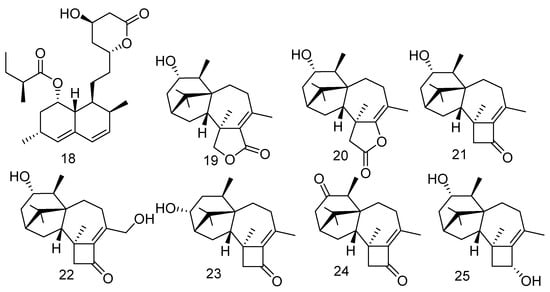 The well-known compound lovastatin (18) was extracted from a coral-derived fungus Aspergillus terreus. In vitro anti-inflammatory experiments showed that 18 has anti-inflammatory activity against NO production and was shown to have a significant inhibitory effect with an IC50 value of 17.45 μM [24]. Meanwhile, compound 18 was an inhibitor of 3-hydroxy-3-methyl-glutaryl-coenzyme as a lipid-lowering drug [25]. Furthermore, compound 18 also exhibited bioactivities of anti-cancer, prevention and treatment of neurological disorders, and antibacterial effects [26]. Two new harziane diterpene lactones, harziane lactones A and B (19 and 20) and five new harziane diterpenes, harzianones A–D (21–24) and harziane (25), were identified from the soft coral-derived fungus Trichoderma harzianum XS-20090075. Compounds 19–23 and compound 25 exhibited obvious phytotoxicity against the seedling growth of amaranth and lettuce with a concentration of 200 ppm. Moreover, at the concentration of 200 μg/mL, compounds 19, 21, 22, and 23 completely inhibited seed germination against amaranth. Compared with the positive control glyphosate, these compounds still showed phytotoxicity at a lower concentration of 50 μg/mL [27] (Figure 2).