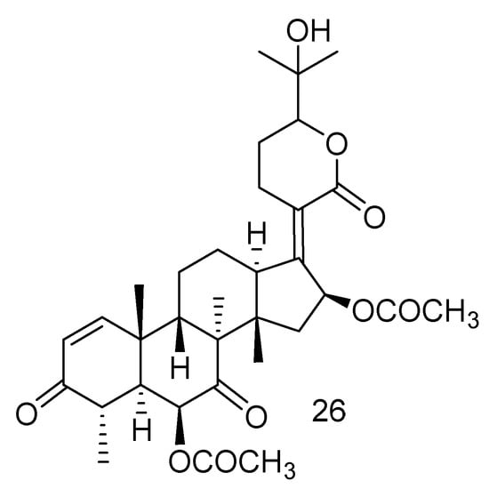 A new nordammarane triterpenoid (26) was characterized from the marine strain Aspergillus fumigatus KMM 4631 collected from the soft coral Sinularia sp. [28] (Figure 3).