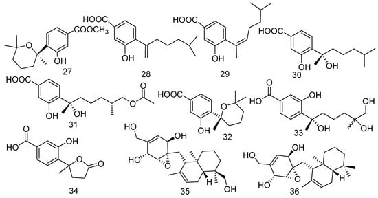 Fungi are the remarkable producers of meroterpenoids, which have exhibited diversified and unique structures with a wide range of bioactivities [29]. Marine-derived fungus Aspergillus sp. was obtained from the gorgonian Dichotella gemmacea collected from the South China Sea, which produced three new phenolic bisabolane-type sesquiterpenoids: (+)-methyl sydowate (27), 7-deoxy-7, 14-didehydrosydonic acid (28), and 7-deoxy-7,8-didehydrosydonic acid (29) [30]. Compound 27 showed bioactivity against S. aureus and methicillin-resistant Staphylococcus aureus (MRSA) with the same inhibition zones of 11 mm in diameter at a concentration of 100 μg/mL, while the positive control had inhibition zones of 37 and 21 mm in diameter, respectively. Moreover, compound 28 showed remarkable inhibitory activity on Gaeumannomyces graminis (MIC = 0.5 μg/mL) [31]. The chemical investigation of Aspergillus versicolor (ZJ-2008015) led to the isolation of three bisabolane sesquiterpene compounds named (+)-sydonic acid (30), expansol G (31), and (+)-sydowic acid (32). An in vitro antibacterial experiment showed that all compounds exhibited strong antibacterial activity with the MIC values of 5.3, 6.4, and 5.4 μg/mL, respectively, for Staphylococcus albus and 2.6, 6.4, and 5.4 μg/mL, respectively, for S. aureus [32]. Moreover, compound 32 also revealed cytotoxicity against murine leukemia P-388 cells (IC50 = 2.56 μg/mL) [33]. Two new phenolic bisabolane-type sesquiterpenes, namely 11,12-dihydroxysydonic acid (33) and 1-hydroxyboivinianic acid (34), were extracted from the marine-derived fungus Scopulariopsis sp. collected from the Red Sea hard coral Stylophora sp. [34]. Meanwhile, compound 34 exhibited weak activity to cancer cell lines A549, Caski, HepG 2, and MCF-7 with IC50 values of 90.6, 78.2, 75.8, and 80.4 μg/mL, respectively. Furthermore, 34 also showed antimicrobial activity against Erwinia carotovora sub sp. carotovora (MIC = 68.9 μg/mL) [35]. Craterellin D (35), a new merosesquiterpenoid, together with its known analog craterellin A (36), was isolated from a soft coral-derived Lophiostoma sp. fungus. Compound 35 was the ramification of the compound 36, whose configuration was confirmed by modified Mosher’s method and single-crystal X-ray diffraction. A primary bioassay indicated that 36 was shown to have antibacterial activity against B. cereus (MIC = 3.12 μM) [36] (Figure 4).