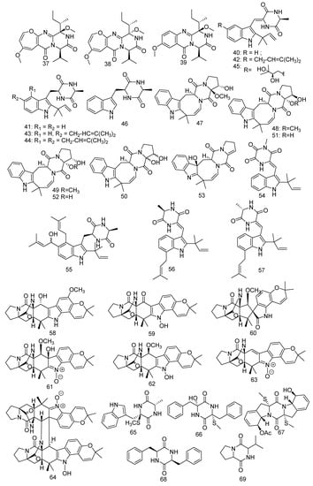 Wang et al. isolated three novel diketopiperazine alkaloids, chrysopiperazines A–C (37–39), from gorgonian-derived fungus Penicillium chrysogenum [38]. In addition, Wang’s group also discovered a strain of Nigrospora oryzae (ZJ-2008005) derived from soft coral Dendronephthya sp., which was found to produce seven isoechinulin-type alkaloids named neoechinulin A (40), preechinulin (41), isoechinulin A (42), tardioxopiperazine A (43), variecolorin L (44), dihydroxyisoechinulin A (45), and L-alanyl-L-tryptophan anhydride (46). A primary bioassay of antifouling activity against the larval settlement of barnacle Balanus amphitrite showed that compound 42 revealed significant antifouling activity with an IC50 value of 5.92 µg/mL, while 40 and 45 presented weak activity with IC50 values of 30 and 50 µg/mL, respectively [39]. Moreover, compound 40 also displayed strong cytotoxic activity against human cervical carcinoma HeLa cells and exerted anti-inflammatory, antiviral, and neuroprotective activity [40,41]. Furthermore, compound 42 revealed inhibitory activities against AChE (IC50 = 74.38 µM), and compounds 40 and 42 demonstrated the DPPH-scavenging effect at IC50 44.30 and 103 µM, respectively, while 41, 43, and 44 were inactive at IC50 > 500 µM [42,43]. In short, 40 was a bioactive compound. Compound 43 exhibited moderate immunosuppressive activity of Con A-induced and LPS-induced with IC50 values of 4.5 and 0.7µM, respectively [44] and compounds 43 and 44 showed very weak cytotoxic effects to NCI-H1975/GR cell lines with the inhibition ratio of 50.94% and 56.83%, respectively, at a concentration of 50 μM [45]. A recent study showed that compound 46 revealed inhibitory activity against TMEM16A with 65% inhibition with a concentration of 5 µg/mL) [46]. Another study found seven new isoechinulin-type alkaloids named 16α-hydroxy-17β-methoxy-deoxydihydroisoaustamide (47), 16β-hydroxy-17α-methoxy-deoxydihydroisoaustamide (48), 16α-hydroxy-17α-methoxy-deoxydihydroisoaustamide (49), 16,17-dihydroxy-deoxydihydroisoaustamide (50), 16β,17α-dihydroxy-deoxydihydroisoaustamide (51), 16α,17α-dihydroxy-deoxydihydroisoaustamide (52), and 3β-hydroxy-deoxyisoaustamide (53) isolated from the coral-derived fungus Penicillium dimorphosporum KMM 4689. On these compounds, neuroprotective activity experiments were conducted. The results indicated that compounds 50 and 52 with a concentration of 1 µM could improve the viability of PQ (paraquat)-treated (PQ = 500 µM) Neuro-2a cells by 38.6% and 30.3%, respectively, while compound 51 increased the cell survival rate by 36.5% and 39.4% at concentrations of 1 μM and 10 µM, respectively [47]. Three new indole diketopiperazine alkaloids named 11-methylneoechinulin E (54), variecolorin M (55), and (+)-variecolorin G (56), together with a known compound, (-)-variecolorin G (57), were extracted from a soft coral-associated epiphytic fungus Aspergillus sp. EGF 15-0-3. Compound 57 showed very weak cytotoxic effects to NCI-H1975/GR cell lines with the inhibition ratio of 40.65% at a concentration of 50 μM [45]. Seven notoamide-type alkaloids were obtained from a culture broth of coral-associated fungus Aspergillus ochraceus LZDX-32-15, including four new congeners, namely notoamides W-Z (58–61) and three reported alkaloids, namely notoamide G (62), avrainvillamide (63), and stephacidin B (64), which displayed inhibition against a panel of hepatocellular carcinoma (HCC) cell lines with IC50 values ranging from 0.42 to 3.39 μM. Compared with the positive control of paclitaxel with a concentration of 10 µM, these compounds also revealed notable growth inhibition against tumor cell lines (human HCC cell line SMMC-772, human colorectal carcinoma cell line HCT-8, human breast cancer cell line MCF-7, and human umbilical vein endothelial cell HUVEC) with an inhibition ratio of more than 95% [48]. In addition, compound 63 displayed considerable antiproliferative activity and reversible inhibition against human GR activity in LNCaP cell lysate (IC50 = 125 µM). But dramatically, compounds 63 and 64 were shown to be a new class of toxins with potential threat to human health in buildings [49,50]. A novel compound pseudellone D (65) was obtained from the marine-derived fungus Pseudallescheria ellipsoidea F42-3 collected from the soft coral Lobophytum crissum [51]. Two novel metabolites diketopiperazines pseuboydones C, D (66, 67) and a known compound cyclo-(Phe-Phe) (68) were produced by the marine-derived fungus associated with the soft coral Lobophytum crissum. The compound 68 showed strong activity against cell line Sf9 from the fall armyworm Spodoptera frugiperda (IC50 = 0.8 µM) [20]. A described compound named cyclo-(Pro-Val) (69) was characterized from the fungus Simplicillium sp. SCSIO 41209 gathered from soft coral and exhibited inhibition to MptpB (IC50 = 25.9 μM) [52] (Figure 5).