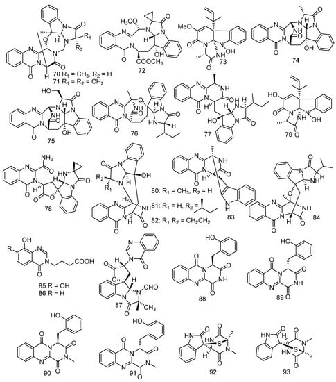 Gorgonian-derived fungus Aspergillus versicolor was considered to be a great potential producer of quinazolinone alkaloids. Cheng et al. conducted research on the gorgonian-derived fungus Aspergillus versicolor LZD-14-1 resulting in the identification of four described metabolites and six new polycyclic alkaloids, namely versiquinazolines A, B, G, and K (70–73) [53] and versiquinazolines L–Q (74–79) [54]. Metabolites 76–79 displayed TrxR inhibitory activity with IC50 values of 20, 12, 13, and 13 μM, respectively [53]. Bioassay results showed that 74–79 exhibited weak activity against cell line A549 at IC50 > 10 μM. Moreover, versiquinazolines P (78) and Q (79) also demonstrated significant inhibition against TrxR with IC50 values of 13.6 μM and 12.2 μM, respectively, while curcumin (positive control group) showed an IC50 value of 25 μM [54]. In addition, three new quinazolinone alkaloids, cottoquinazolines B-D (80–82), were produced from Aspergillus versicolor LCJ-5-4. The bioassay test indicated that only 82 revealed middling antifungal activity against Candida albicans (MIC = 22.6 μM) [55]. A previously unreported alkaloid, namely fumiquinazoline K (83) was discovered from a marine strain of Aspergillus fumigatus KMM 4631 [28]. Studies on gorgonian-derived fungus Scopulariopis sp. led to the isolation of fumiquinazoline L (84) which showed weak antibacterial activity against pathogenic bacteria B. subtilis, S. albus, and Vibrio parahemolyticus (MIC = 50 μM) [56]. Two new quinazolinone analogues, namely 4-(7,8-Dihydroxy-4-oxoquinazolin-3(4H)-yl), butanoic acid (85) and 4-(8-Hydroxy-4-oxoquinazolin-3(4H)-yl) butanoic acid (86), were isolated from the fungus Xylaria sp. FM1005, which was gathered from a leather coral Sinularia densa found in the area of the Big Island, Hawaii [57]. Further investigation of Neosartorya laciniosa (KUFC 7896) led to the isolation of a novel tryptoquivaline derivative, tryptoquivaline T (87) [58]. Two new alkaloid racemates, (±)-17- hydroxybrevianamide N (88&89) and (±)-N1-methyl-17-hydroxybrevia-namide (90&91), possessing a peculiar O-hydroxyphenylalanine residue and an imide subunit were obtained from a soft coral-derived Aspergillus sp. [59]. Another two new alkaloids namely pseudellones A (92) and B (93) were produced by the marine-derived fungus Pseudallescheria ellipsoidea F42−3, which was collected from a soft coral Lobophytum crissum [60] (Figure 6).