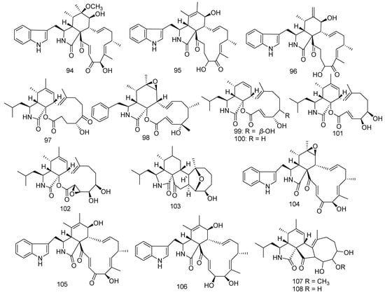 Previous chemical exploration on the Chaetomium globosum C2F17 led to the separation of 6-O-methyl-chaetoglobosin Q (94), chaetoglobosin E (95), and chaetoglobosin Fex (96). Furthermore, in an in vitro anticancer experiment, 95 exhibited strong inhibitory activity against cell lines HCT-116, K562, A549, Huh7, H1975, MCF-7, U937, BGC823, HL60, HeLa, and MOLT-4, with IC50 values of 13.5, 8.9, 5.9, 1.4, 9.2, 2.1, 1.4, 8.2, 2.5, 2.8, and 1.4 µM, respectively. Compound 96 revealed selective cytotoxic activity against cell lines Huh7, MCF-7, U937, and MOLT-4, with IC50 values of 3.0, 7.5, 4.9, and 2.9 µM, respectively, and also exhibited anti-inflammatory activity [61,62,63]. Aspergillus elegans ZJ-2008010, isolated from a soft coral Sarcophyton sp. in the South China Sea, produced seven cytochalasins, namely aspochalasin A1 (97), cytochalasin Z24 (98), aspochalasin I (99) aspochalasin J (100), aspochalasin D (101), aspochalasin H (102), and aspergillin PZ (103). According to the experimental data of biological activity assay, 99–102 showed notable antifouling activity to the larval settlement of the barnacle Balanus amphitrite with EC50 values of 34, 14, 6.2, and 37 μM, respectively. Moreover, 101 also presented antibacterial activity against S. albus, S. aureus, Escherichia coli, and B. cereus (MIC = 10 μM), while compound 99 was found to have weak activity against Staphylococcus epidermidis and S. aureus with MIC values of 20 and 10 μM, respectively; and compound 103 as well showed very weak activity against S. epidermidis (MIC = 20 μM). Furthermore, compound 99 possessed potential inhibition to melanogenesis in Mel-Ab cells (IC50 = 22.4 μM) [64]. Moreover, compound 103 displayed DPPH free radical-scavenging effects increasing with concentrations and anticancer activity against the A2780, LNCaP, and PC3 cell lines [65,66]. Another three cytochalasins, chaetoglobosins A and B (104 and 105), and cytoglobosin C (106) were obtained from the fungus Chaetomium globosum RA07-3 [67]. Compounds 104 and 105 exerted outstanding inhibition against Tetragenococcus halophilus with MIC values of 0.7 and 0.4 μM, respectively. Compound 106 also showed antibacterial activity against T. halophilus (MIC = 0.7 μM). Meanwhile, this group also obtained aspochalasin K (107) and aspochalasin E (108) from Aspergillus sp. XS-2009-0B15. In bioassays, 107 revealed antibacterial activity, while 108 showed anticancer activity against B16-F10 and HCT-116 with IC50 values of 18.5 and 6.3 μg/mL, respectively [68,69] (Figure 7).