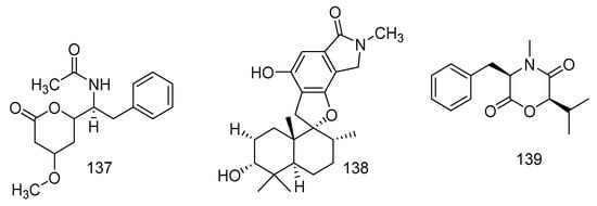 The gorgonian coral-derived fungus Scopulariopsis sp. was regarded as a producer of five dihydroquinolin-2-one-containing alkaloids including three monoterpene alkaloids [70] and a new alkaloid. They were 4-phenyl-3, 4-dihydroquinolin-2(1H)-one named aniduquinolone A (109), aflaquinolone A (110), aflaquinolone D (111), and two 4-phenyl-3,4-dihydroquinolin-2(1H)-one named 6-deoxyaflaquinolone E (112) and aflaquinolone F (113), and a new metabolite named scopuquinolone B (114) [71]. All compounds (109–114) exhibited notable antifouling activity against the settlement of B. amphitrite cyprids with EC50 values of 17.5 pM, and MIC values of 28 nM, 2.8 nM, 1.04 μM, 0.86 μM, and 0.103 μM, respectively. Scopuquinolone B (114) possessed a high therapeutic ratio (LC50/EC50) of 222, which is stronger than the positive control Sea Nine 211 (EC50 = 4.36 μM, LC50/ EC50 = 20). Besides, no cytotoxicity was found in 109 or 110; thus, they could be considered as new nontoxic anti-larval settlement compounds, especially 109 as a potential antifouling lead compound, which possessed safety and a high therapeutic ratio (LC50/EC50 = 1200) in nature. Another study revealed that the epimers of compound 109 exhibited considerable antibacterial activity against S. aureus (ATCC700699) [72]. Compound 110 showed lethality against brine shrimp (Artemia salina, LD50 = 5.5 μM) [73]. Furthermore, 112 revealed broad antibacterial spectrum of S. aureus, B. cereus, Vibrio parahaemolyticus, N. brasiliensis, and P. putida, with MIC values of 0.78, 1.56, 6.25, 0.78, and 1.56 μM, respectively. Five new compounds were found in the associated-coral fungus Xylaria sp. FM1005, namely sinuxylamide A (115), sinuxylamide B (116), sinuxylamide C (117), sinuxylamide D (118), and assinuxylamide E (119). Compounds 115 and 116 also showed significant inhibition against the binding of fibrinogen to purified integrin IIIb/IIa in a dose-dependent manner with IC50 values of 0.89 and 0.61 μM, respectively [57]. A new compound pseuboydone E (120) and three described compounds, namely speradine C (121), 24, 25-dehydro-10,11-dihydro-20-hydro-xyaflavinin (122), and aflavinine (123), were found in a fungus associated to Lobophytum crissum. All known compounds revealed notable inhibition activity against the Sf9 cells with IC50 values of 0.9, 0.5, and 0.4 μM, respectively. Compounds 122 and 123 also showed similar significant cytotoxicity to the positive control, rotenone [20]. Ten alkaloids were produced by coral-derived fungi Aspergillus terreus including eight new alkaloids: aspergillspins A-E (124–128) [74], luteoride E (129) [24], 22-O-(N-Me-L-valyl) aflaquinolone B (130), and 22-O-(N-Me-L-valyl)-21-epi-aflaquinolone B (131) [75], and two known metabolites asperteramide A (132) and methyl 3,4,5-trimethoxy-2-(2-(nicotinamido) benzamido) benzoate (133). In addition, compound 131 revealed excellent anti-respiratory syncytial virus activity (IC50 = 42 nM) [75]. Moreover, compound 132 displayed evident antimicrobial activity against E. coli, Acinetobacter baumannii, P. aeruginosa, Klebsiella pneumonia, MRSA, Enterococcus faecalis, and C. albicans with MIC values of 8, 8, 16, 64, 64, 8, 2 μg/mL, respectively [76]. In addition, luteoride E (129) and methyl 3,4,5-trimethoxy-2-(2-(nicotinamido) benzamido) benzoate (133) exerted anti-inflammatory activity against NO production with IC50 values of 24.64 and 5.48 μM, respectively. Neoaspergillic acid (134), also derived from fungus Aspergillus sp. SCSGAF0093, exhibited bio-toxicity against the brine shrimp (Artemia salina) with an IC50 value of 90.08 µM and also demonstrated anticancer activity against SPC-A-1, BEL-7402, SGC-7901, and K562 with IC50 values of 22.2, 24.9, 8.2, and 8.0 µM, respectively. Moreover, compound 134 possessed antibacterial activity (S. aureus, S. epidermidis, B. subtilis, Bacillus dysenteriae, Bacillus proteus, E. coli) with a MIC of 1.0, 0.5, 1.9, 7.8, 7.8, and 15.6 μg/mL, respectively [77,78]. A new natural product, ethyl 2-bromo-4-chloroquinoline-3- carboxylate (135), was isolated from soft coral-associated fungus Trichoderma harzianum (XS-20090075), which was the first halogenate quinoline metabolite from the genus Trichoderma [79]. An undescribed alkaloid, namely scopulamide (136) was derived from the marine-derived fungus Scopulariopsis sp., which was found in the Red Sea hard coral Stylophora sp. [34]. Pyrophen (137) was identified from the Alternaria alternata strain D2006 associated with soft coral and was shown to be active against C. albicans with the inhibition zone 28 mm [80]. One undescribed phenylspirodrimane derivative, named arthproliferin E (138), was isolated from the soft coral-associated fungus Stachybotrys chartarum SCSIO41201 [81]. (3R,6R)-bassiatin (139) was isolated from the soft coral-derived fungus Dichotomomyces sp. L-8 and displayed significant cytotoxic activities against the human breast cancer cell line MDA-MB-435 and human lung cancer cell line Calu3 with IC50 values of 7.34 and 14.54 µM, respectively [82] (Figure 8).