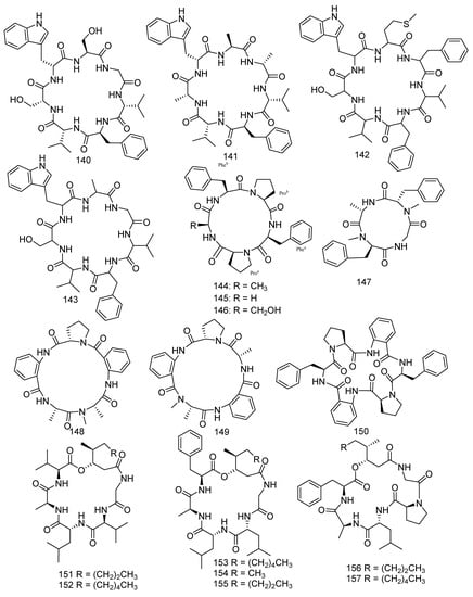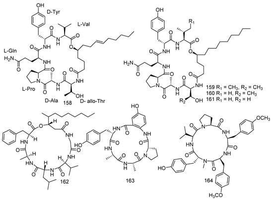 A study reported that cyclopeptides displayed high effects against various cancer cells, and some of them were even applied in clinical experiments [83]. Previous chemical exploration of Aspergillus versicolor led to the separation of 11 new cycloheptapeptides, namely, asperheptatides A−D (140−143) [84], versicoloritides A-C (144–146) [85], versicotides D–F (147–149) [86], and aspersymmetide A (150) [87]. Versicotides D–F (147–149) showed anti-atherosclerosis activity [86]. Aspersymmetide A (150) exerted weak anticancer activity against NCI-H292 and A431 with an inhibition ratio of 53.8% and 63.62% (10 μM), respectively [87]. Penicillium chrysogenum (CHNSCLM-0003), isolated from gorgonian coral, produced seven new cyclohexadepsipeptides, chrysogeamides A–G (151–157). Furthermore, compounds 151 and 152 were shown to have angiogenic activity toward zebrafish embryo (IC50 = 1.0 μg/mL) with a non-cytotoxic concentration of 100 μg/mL [88]. A new compound sinulariapeptide A (158) and three described compounds, simplicilliumtides A (159), B (160) and J (161) were derived from the soft coral-associated fungus Simplicillium sp. SCSIO 41209. In the bioassays, compounds 158–161 showed inhibition to Colletotrichum asianum with the MIC values of 4.9, 19.5, 4.9, and 9.8 μg/mL, respectively, while a positive control (actidione) with a MIC value of 10 μg/mL. Moreover, compound 160 was found to have notable inhibition to Pyricularia oryzae, while 159 and 161 exhibited weak inhibitory activities with the MIC values of 9.8, 19.5, and 78.1 μg/mL, respectively [52]. Scopularide A (162) was obtained from the fungus Scopulariopsis sp. Collected from the Red Sea hard coral Stylophora sp., which revealed remarkable cytotoxicity to the growth of the murine lymphoma cell line (L5178Y) (IC50 = 1.2 µM) [34]. Two new metabolites, asperpeptide A (163) [89] and aspergillipeptide D (164) [90], were isolated from the coral-derived fungus Aspergillus sp. Asperpeptide A (163) displayed antibacterial activity (B. cereus and S. epidermidis) with the same MIC value of 12.5 μM [89], while aspergillipeptide D (164) exhibited considerable antiviral activity against HSV-1 (IC50 = 9.5 μM) [90] (Figure 9).