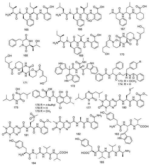 Four new compounds named sinulariapeptides B−E (165–168), together with a known metabolite hirsutellic acid A (169), were isolated from a culture broth of the soft coral-derived fungus Simplicillium sp. SCSIO 41209. Hirsutellic acid A (169) showed inhibition to MptpB (IC50 = 35.0 µM) [52]. (+) - and (−) - pestaloxazine A (170, 171), a pair of new enantiomeric alkaloid dimmers, was derived from a Pestalotiopsis sp., which have a new symmetric spiro-(oxazinane-piperazinedione) skeleton [91]. Compound 170 exhibited significant antiviral activity to EV71 (IC50 = 14.2 μM) stronger than the positive control ribavirin (IC50 = 256.1 μM). In addition, a new compound named pseudellone C (172) was found in the fungus Pseudallescheria ellipsoidea F42−3, and 172 was found for the first time in previous literature possessing a unique skeleton [60]. The genus Aspergillus was widely investigated and yielded a variety of metabolites. Thirteen compounds were isolated from coral-derived Aspergillus sp.: namely 4’-OMe-asperphenamate (173), asperphenamate (174), aspergilliamide (175), ochratoxin A n-butyl ester (176), flavacol (177), ochratoxin A (178) and ochratoxin A methyl ester (179), penilumamides B-D (180–182), and aspergillipeptides E–G (183–185). 4’-OMe-asperphenamate (173), a new phenylalanine derivative, along with a known phenylalanine derivative asperphenamate (174), was isolated from Aspergillus elegans ZJ-2008010, which was collected from a soft coral Sarcophyton sp. in the South China Sea. Both of them exhibited selective antibacterial activity against S. epidermidis, with a MIC value of 10 μM for each [65]. A novel and four known metabolites, aspergilliamide (175), ochratoxin A n-butyl ester (176), flavacol (177), ochratoxin A (188), and ochratoxin A methyl ester (189) were obtained from the strain Aspergillus sp. SCSGAF0093. Compounds 175–179 showed bio-toxicity against the brine shrimp (Artemia salina) with LC50 values of 71.09, 4.14, 205.67, 13.74, and 2.59 µM, respectively. Flavacol (177) also displayed inhibition against NADH oxidase (IC50 = 13.0 μM). Meanwhile, ochratoxin A (178) was reported as a potential nephrotoxin and latent human carcinogen [77,92,93]. Aspergillus sp. XS-20090B15 was the source of three new peptides, penilumamides B-D (180–182) [89]. Moreover, Aspergillus sp. SCSIO 41501 also yielded three novel linear peptides, aspergillipeptides E–G (183–185), and compound 183 displayed antiviral activity against HSV-1 (IC50 = 19.8 μM) [90] (Figure 10).