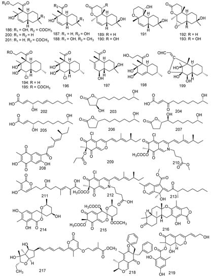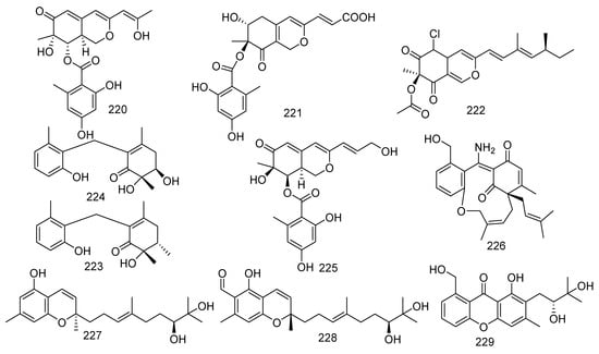 The following study is of great significance for some antifouling active compounds. Fourteen new polyketides named libertalides A−N (186–199), along with two known analogues aspermytin A and its acetate (200, 201) were produced by the coral-associated fungus Libertasomyces sp. In the bioassays, 187, 193, and 200 significantly induced the proliferation of CD3+ T cells with a concentration of 3 μM. Meanwhile, 190, 194, 197, and 201 obviously increased the CD4+/CD8+ ratio with 3 μM. It was the first report in the immunoregulatory activity of these metabolites [94]. In addition, aspermytin A (200) was found with activity against neurite outgrowth in rat pheochromocytoma (PC-12) cells (50 μM) [95]. Two new C12 polyketides (202, 203) with four known derivatives (204–207) were produced from a soft coral-derived fungus Cladosporium sp. TZP-29. They were named cladospolides E and F (202 and 203), secopatulolides A and C (204 and 205), 11-hydroxy-γ-dodecalactone (206), and iso-cladospolide B (207). Moreover, 202, 204–206 exerted notable lipid-lowering activity in HepG2 hepatocytes with IC50 values of 12.1, 8.4, 13.1, and 7.1 μM, respectively [96]. Four new polyketides, including an unusual naphthoquinone derivative sclerketide A (208), two azaphilone analogous sclerketides B (209) and C (210), and an α-pyrone derivative sclerketide D (211), together with two known compounds, namely isochromophilone IX (212) and sequoiatone B (213), were isolated from the gorgonian-derived fungus Penicillium sclerotiorum CHNSCLM-0013. Compounds 209–213 exhibited a potential inhibitory effect against the production of NO with the IC50 values of 3.4, 2.7, 5.5, 17.6, and 5.2 μM, respectively. As the most active compound, 210 also showed moderate cytotoxicity (IC50 = 14.8 μM) [97]. Some other new antibacterial chloro-containing polyketides were identified from alga-derived fungus [98]. Furthermore, isochromophilone IX (212) presented outstanding antibacterial activity against MRSA (MIC = 50 μg/mL) [99]. The marine strain Penicillium glabrum glmu003 yielded two novel azaphilone compounds, daldinins G (214) and H (215), and a known compound austalide V (216). Moreover, austalide V (216) exhibited weak inhibitory activity against pancreatic lipase (IC50 = 23.9 μg/mL) [100]. A new asteltoxin B (217) was obtained from the gorgonian-associated fungus Aspergillus sp. SCSGAF 0076 and revealed inhibition to human acetylcholinesterase (IC50 = 14.9 μM) [101,102]. Wang et al. found eight polyketides from gorgonian coral-derived fungus, namely aspergilone A (218), pinophilins D−F (219–221) [103], (+)-sclerotiorin (222), microketides A and B (223 and 224), and epi-pinophilin B (225). A novel compound, aspergilone A (218), was isolated from the fungus Aspergillus sp. and displayed antifouling activity against Balanus amphitrite (EC50 = 25 μg/mL) [104]. Penicillium pinophilum XS-20090E18 produced three new metabolites, pinophilins D−F (219–221). A bioactive azaphilone derivative, (+)-sclerotiorin (222) was also discovered from the Penicillium sclerotiorum fungus and possessed a wide range of bioactivities, which inhibited the larval settlement of barnacle Balanus amphitrite (EC50 = 5.6 μg/mL) and showed evident inhibition to B. subtilis, B. cereus, and Sarcina lutea with MIC values of 0.16, 0.31, and 0.31 μM, respectively [105,106]. A pair of epimeric polyketides, microketides A and B (223 and 224), were isolated from the fungus Microsphaeropsis sp. RA10-14; and 223 exhibited potential antibacterial activity against P. aeruginosa, N. brasiliensis, K. rhizophila, and Bacillus anthraci with the same MIC value of 0.19 μg/mL [107]. A novel metabolite was characterized from the fungus Aspergillus fumigatus 14–27 and identified as epi-pinophilin B (225) by spectroscopic and chemical methods [108]. From soft coral-derived fungus Stachybotrys chartarum SCSIO41201, four new polyketide derivatives, named arthproliferins A–D (226–229), were isolated; and compound 226 was found to show weak inhibitory activity against MRSA ATCC 29213 (MIC = 78 µg/mL) [81]. Polyketide pigment produced by Talaromyces spp. has been reported as a non-toxic red Monascus-like azaphilone pigment. Therefore, polyketides were not only a class of bioactive compounds, but also have been characterized as a source of red pigments [109] (Figure 11).