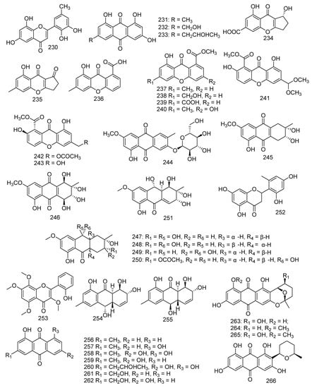 Cultivation of Penicillium sp. SCSGAF 0023 yielded a new polyketide, 6,8,5’6’-tetrahydroxy-30 methyl-flavone (230), and three known analogs emodin (231), citreorosein (232), and isorhodoptilometrin (233). Compounds 230–232 displayed significant antifouling activity against Balanus amphitrite larvae settlement with EC50 values of 6.7, 6.1, 17.9, and 13.7 μg/mL, respectively [110]. A new benzopyranone namely coniochaetone K (234), together with six known compounds, named coniochaetone A (235), 8-hydroxy-6-methylxanthone-1-carboxylic acid (236), methyl 8-hydroxy-6-methyl-9-oxo-9H-xanthene-1- carboxylate (237), methyl 8-hydroxy-6-(hydroxymethyl)-9-oxo-9H-xanthene-1-carboxylate (238), 8-(methoxycarbonyl)-1-hydroxy-9-oxo-9H-xanthene-3-carboxylic acid (239), and 3,8-dihydroxy-6-methyl-9-oxo-9H-xanthene-1-carboxylate (240), were obtained from the Beibu Gulf-derived coral symbiotic fungus Cladosporium halotolerans GXIMD 02502. Moreover, all compounds 234–240 at a concentration of 10 μM revealed outstanding cytotoxicity against two human prostatic cancer cell lines, C4-2B and 22RV1, with an inhibitory rate ranging from 55.8% to 82.1%. Among them, compound 240 was found to be the strongest with inhibitions of 82.1% and 77.7%, respectively [111]. In addition, compound 240 also showed activity against cell lines K562, HL-60, HeLa, and BGC-823 at a concentration of 100 μg/mL with an inhibition rate of 36.1%, 62.4%, 13.9%, and 11.4%, respectively [112]. Three metabolites were identified as 12-dimethoxypinselin (241), 12-O-acetyl-AGI-B4 (242), and AGI-B4 (243); from solid rice cultures of the marine-derived fungus Scopulariopsis sp., which was collected from the Red Sea hard coral Stylophora sp.. Compound 243 showed significant cytotoxicity against L5178Y mouse lymphoma cells (IC50 = 1.5 µM) [34]. A new anthraquinone derivative macrosporin 2-O-α-D-glucopyranoside (244), together with two known analogues altersolanol B (245) and altersolanol A (246), were obtained from the fungus Stemphylium lycopersici. Compound 245 exhibited evident activities against HCT-116 and MCF-7 cancer cell lines, with the IC50 values of 3.5 and 9.0 μM, respectively, while 246 showed IC50 values of 1.3 and 7.2 μM, respectively. Moreover, compound 246 also exhibited growth inhibition against Huh7 cancer stem cell-like cells (IC50 = 38.0 μM) [113]. In addition, compound 246 exhibited cytotoxic, cytostatic, anti-inflammatory, and anti-migrative activity against K562 and A549, surprisingly, while it had no effect on normal cells [114]. Wang et al. isolated 20 metabolites from coral-associated fungus. A number of new compounds were derived from the mycelia of the Alternaria sp. ZJ-2008003 strain isolated from a Sarcophyton sp. soft coral in South China Sea, including tetrahydroaltersolanols C−F (247–250) and dihydroaltersolanol A (251). The results of the antiviral activity indicated that compound 247 exhibited activity against PRRSV (IC50 = 65 μM) [115]. Investigation of the Penicillium chrysogenum derived from gorgonian resulted in the isolation of a new flavone, penimethavone A (252), and exhibited middling anticancer activity against HeLa and rhabdomyosarcoma cell lines with IC50 values of 8.41 and 8.18 μM, respectively [116]. Aspergillus candidus derived from the gorgonian coral Anthogorgia ochracea collected from the South China Sea produced a new compound, aspergivone B (253), which showed weak inhibition against α-glucosidase (IC50 = 244 μg/mL) [117]. Two new hydroxyanthraquinones, harzianumnones A (254) and B (255), together with seven known analogues (256–262), namely pachybasin (256), chrysophanol (257), frangulaemodin (258), phomarin (259), (+)-20S-isorhodoptilometrin (260), 1-hydroxy-3-hydroxymethylanthraquinone (261), and Ω-hydroxydigitoemodin (262) were discovered from the soft coral-associated fungus Trichoderma harzianum (XS-20090075). Compounds 256, 257, 258, 260, and 262 displayed moderate AChE inhibitory effects at the concentration of 100 μM. Compounds 258, 260, and 261 showed weak antibacterial activity against S. aureus with the MIC values of 6.25, 25.0, and 25.0 μM, respectively. Compounds 260 and 261 exhibited cytotoxicity against hepatoma cell line HepG2 with IC50 values of 2.10 and 9.39 μM, respectively. Compound 260 was still found to reveal cytotoxicity against cervical cancer cell line HeLa (IC50 = 8.59 μM) [118]. For use as a bio-agricultural agent with antifungal activity against phytopathogenic fungi, pachybasin (256) induced toxicity in zebrafish embryos in a dose-dependent manner. In addition, chrysophanol (257) displayed activity against human malignancy of colorectal cancer [119,120]. Three described analogues and a new anthraquinone derivative, named nidurufin (263), 8-O-methylaverufin (264), averufanin (265), and 8-O-methylnidurufin (266), were produced by fungus Aspergillus sp. derived from the gorgonian coral Dichotella gemmacea. Furthermore, nidurufin (263) exhibited excellent inhibition against K562 and HL-60 cell lines with IC50 values of 0.87 and 1.46 µM, respectively. Meanwhile, 8-O-methylnidurufin (266) and 8-O-methylaverufin (264) showed antibacterial activity against Micrococcus luteus with the same MIC values of 6.25 µM. Moreover, 264 was also active against Mucor miehei and 265 exhibited inhibitory effects on ACAT1 and ACAT2 with IC50 values of 28 and 12.1 µM, respectively [121,122,123] (Figure 12).
