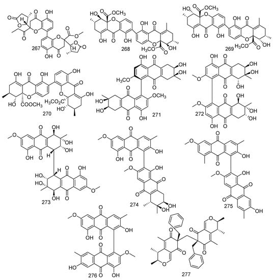 From a Penicillium sp. SCSGAF 0023, a new compound paecilin C (267) and three known compounds, secalonic acid D (268), secalonic acid B (269), and penicillixanthone A (270), were obtained; and compounds 268–270 found to show medium antibacterial activity against M. luteus, Pseudomonas nigrifaciens, E. coli, and B. subtilis with MIC values ranging from 24.4 to 390.5 µg/mL. In addition, compound 268 at a concentration of 3.125 µg/mL also displayed inhibition to the growth of Serratia onedensis MR-1 [110]. Furthermore, 268 displayed anti-tumor activity against the K562 cell line and cytotoxic activity on the human pancreatic carcinoma PANC-1 cells accustomed to glucose-starved conditions (IC50 = 0.6 µM). In addition, compounds 268 and 269 revealed inhibition against S. aureus biofilm formation at more than 90% at 6.25 µg/mL, while 268 facilitated the development of biofilm to some extent [124,125,126]. The following seven new metabolites were found from coral-associated fungus. A new anthraquinone derivative, alterporriol Y (271), was obtained from the fungus Stemphylium lycopersici [113]. Alternaria sp. ZJ-2008003 yielded five novel alterporriol-type anthranoid dimers named alterporriols N−R (272–276) [115]. Besides producing polyketides, Aspergillus sp. collected from a gorgonian Dichotella gemmacea also yielded a novel compound, aspergilone B (277) [104]. The data showed that compound 274 exhibited cytotoxic activity for PC-3 and HCT-116 cell lines with the IC50 values of 6.4 and 8.6 μM, respectively, and compound 275 also showed activity against PRRSV (IC50 =22 μM) (Figure 13).
