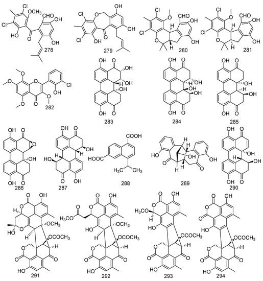 A study on fungus Pestalotiopsis sp. led to the separation of four compounds, pestalone (278) and pestalachloride B (279), (±) – pestalachloride C (280), and (±) – pestalachloride D (281). Pestalone (278) displayed activities against MRSA, 30740, 31007, 31692, 31709, 31956, Bacillus megaterium, and Micrococcus lysodeikticus with MIC values of 12.5, 6.25, 12.5, 12.5, 12.5, 0.078, and 6.25 μM, respectively, while pestalachloride B (279) displayed moderate activities against S. aureus [127]. Recent biological tests indicated that 278 exhibited moderate cytotoxicity in the National Cancer Institute’s 60 human cell line and inhibited MRSA (MIC = 37 ng/mL) [128,129]. (±) - Pestalachloride D (281), a new chlorinated benzophenone derivative, along with a related analog (±) – pestalachloride C (280), was active against E. coli, Vibrio anguillarum, and V. parahaemolyticus with the MIC values of 5, 10, and 20 μM, respectively. But in the biological activity results of zebrafish, indicated compound 281 did not display any effect on a zebrafish embryo teratogenicity assay, while 280 shows abnormal growth effects [130]. Aspergillus candidus cultured from the gorgonian coral Anthogorgia ochracea collected from the South China Sea produced a novel metabolite, aspergivone A (282) [117]. A novel skeleton structure compound represents a class of perylene derivatives with a partially perylene quinone. They were named 7-epi-8-hydroxyaltertoxin I (283), stemphytriol (284), altertoxin I (285), stemphyltoxin II (286), and stemphyperylenol (287). These five perylene derivatives were found from the marine-derived fungi Alternaria sp. ZJ-2008017 collected from a soft coral Sarcophyton sp. Compounds 283–286 were obtained from bioactive experiments of the teratogenicity and lethality of zebrafish embryo and antifouling activity. The bioassay results indicated that 285 exhibited notable teratogenicity (LC50 = 4.54 μg/mL) and lethality (EC50 = 4.21 μg/mL) of zebrafish embryo and had potent antifouling activity against the barnacle Balanus amphitrite (IC50 = 0.27 μg/mL). It might be a potential antifouling agent [131]. In addition, altertoxin I (285) could cause DNA damage, while stemphyperylenol (287) was found to be active against E. coli, S. aureus, and multi-drug-resistant P. aeruginosa [132,133,134]. Naphthalenedicarboxylic acid (288), a novel compound, was isolated from the fungus Xylaria sp. FM1005, discovered from Sinularia densa [57]. The soft-coral-derived fungus Alternaria alternata L3111′A was the source of a new perylenequinone-related compound, alternatone A (289), and a known perylenequinone named alterperylenol (290). Alternatone A (289) displayed anticancer activity against the human hepatoma carcinoma HepG-2 cell line. In addition, alterperylenol (290) exhibited cytotoxicity against A-549, HCT-116, and HeLa cell lines with IC50 values of 2.6, 2.4, and 3.1 μM, respectively [135,136]. Four new oligophenalenone dimers were yielded from the soft coral-associated fungus Talaromyces verruculosus named verruculosins A–B (291, 292), bacillisporin F (293), and xenoclauxin (294). Among which, compounds 291, 293, and 294 displayed middle inhibitory activity against CDC25B with IC50 values of 0.38, 0.40, and 0.26 µM, respectively. Furthermore, bacillisporin F (293) also exerted antibacterial activity against S. aureus with a MIC value of 15.6 µg/mL [137,138] (Figure 14).