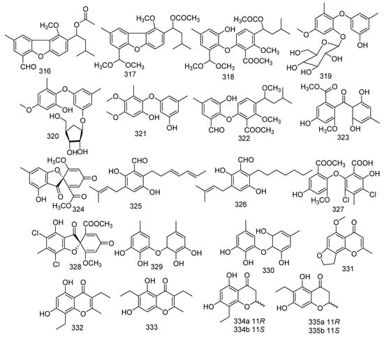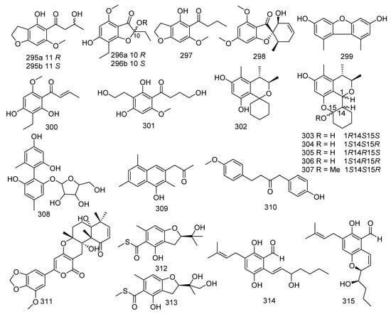 Two new chromanones named phomalichenones H, J (295, 296) and a described compound phomalichenone D (297) were obtained from the coral-associated fungus Parengyodontium album SCSIO 40430. Compound 297 revealed inhibition against MRSA shhs-A1, with MIC values of 32–64 μg/mL [139]. A new griseofulvin derivative, eupenigriseofulvin (298), was yielded from the EtOAc extract of Eupenicillium sp. SCSIO41208 [140]. 3,7-dihydroxy-1,9-dimethyl dibenzofuran (299) was obtained from a soft coral-derived fungus Talaromyces sp. SCSIO 041201. The biological assay indicated that compound 299 displayed antifouling activity against Bugula neritina larva with a LC50 value of 3.06 μg/mL; and it showed moderate antibacterial activities against E. coli, MRSA, S. aureus, and E. faecalis, with MIC values ranging from 0.45 to 15.6 μg/mL, respectively [141]. Two known analogues named phomalichenone A (300) and phomalichenone B (301) were isolated from the coral-derived fungus Parengyodontium album sp. SCSIO 40430, and both of them showed inhibitory activity against MRSA shhs-A1 and Mycobacterium tuberculosis H37Ra with MIC values of 64, 64, 16, and 64 μg/mL, respectively [139]. Six new citrinin analogues penicitols A (302), E−I (303–307), were isolated from a coral-associated fungus Penicillium citrinum, of which 302 exhibited cytotoxic activity against K562, A549, HL-60, BEL-7402, MCE-7, HCT-116, and MDA-MB-231 tumor cells, with IC50 values of 8.8, 28, 20, 12, 15, 24, and 26 μM, respectively. Moreover, 307 showed cytotoxic activity against A549 and BEL-7402, with IC50 values of 19 and 17 μM, respectively. Compounds 302 and 307 displayed antibacterial activity against S. aureus, B. subtilis, and Vancomycin-resistant E. faecalis 1010798 (VRE), with MIC values of 16, 32, 32 and 64, 32, 32 μM, respectively [142]. A new polyphenol, talaversatili A (308), was isolated from a soft coral-derived fungus Talaromyces sp. SCSIO 041201 [141]. The strain Dichotomomyces sp. L-8 associated with the soft coral Lobophytum crissum produced two new compounds, dichotones A (309) and B (310) [82]. Territrem A (311) was isolated and identified from a coral-derived fungus Aspergillus terreus. Compound 311 was active against NO production with significant inhibitory potency (IC50 =29.34 μM) [24]. Two new sulfur-containing benzofuran derivatives, eurothiocins A (312) and B (313), were produced by the fungus Eurotium rubrum SH-823, which was gathered from a Sarcophyton sp. soft coral collected in the South China Sea. Compounds 312 and 313 showed strong inhibitory effects against α-glucosidase with IC50 values of 17.1 and 42.6 μM, respectively. A recent study showed that 312 displayed anti-neuroinflammatory effects [143,144]. Shao et al. found eight novel metabolites and seven known compounds from coral-derived fungi, which were identified as 3′-OH-tetrahydro-auroglaucin (314) and (3′S*,4′R*)-6-(3′,5-epoxy-4′-hydroxy-1′-heptenyl)-2-hydroxy-3-(3′′-methyl-2′′-butenyl) benzaldehyde (315), talaromycins A–C (316–318), phomaethers A–C (319–321); and tenellic acid A methyl ester (322), sulochrin (323), (–)-bis-dechlorogeodin (324), isodihydroauroglaucin (325), flavoglaucin (326), 2,4-diphenyldichloroasterric acid (327), and geodin (328), respectively. Two novel metabolites, 3′-OH-tetrahydro-auroglaucin (314) and (3′S*,4′R*)-6-(3′,5-epoxy-4′-hydroxy-1′-heptenyl)-2-hydroxy-3-(3′′-methyl-2′′-butenyl) benzaldehyde (315) were gathered from a fungus Eurotium sp. [145]. Three novel diphenyl ether derivatives, talaromycins A–C (316–318), together with a known metabolite tenellic acid A methyl ester (322), were obtained from fungus Talaromyces sp. In addition, compound 318 exerted inhibition against the larval settlement of the barnacle Balanus amphitrite with an EC50 value of 2.8 μg/mL. Furthermore, compound 322 showed outstanding anticancer activity against HepG2, Hep3B, MCF-7/ADR, PC-3, and HCT-116 with IC50 values of 4.3, 9, 8.2, and 9.8 μM, respectively. [146]. Another three new compounds, phomaethers A–C (319–321) were obtained from a gorgonian-derived fungus Phoma sp. (TA07-1), while compounds 319 and 321 exhibited evident antibacterial activity against five pathogenic bacteria (S. albus, S. aureus, E. coli, V. parahaemolyticus, V. anguillarum) with MIC values ranging from 0.312 to 10 μM [147]. Examination of the fungus Aspergillus sp. associated with coral led to the separation of six known compounds. Both sulochrin (323) and (–)-bis-dechlorogeodin (324) isolated from Aspergillus sp. derived from soft coral were active against V. anguillarum, Aeromonas salmonicida, and P. aeruginosa with MICs of 15.06, 15.15, 7.53 μM and 30.12, 30.3, and 3.78 μM, respectively. Moreover, 324 also revealed moderate activity against Jurkat, A549, and HeLa cells with IC50 values of 10.69, 10.69, and 3.56 μM, respectively [148]. Two known benzaldehyde compounds, isodihydroauroglaucin (325) and flavoglaucin (326), exhibited evident antiviral activity against HSV-1 with EC50 values of 4.73 and 6.95 μM, respectively. In addition, flavoglaucin (326) displayed considerable activity against DPPH (IC50 = 11.3 μM) [149,150]. Two known derivatives were isolated from soft coral Sinularia sp. derived fungus Aspergillus sp., namely 2,4-diphenyldichloroasterric acid (327) and geodin (328). In the bioassays, compound 327 displayed inhibition to S. aureus (MIC = 12.5 μM) and 328 exhibited cytotoxic activity against six human cancer cell lines, including BT474, NCI-H460, H-1975, K562, DU145, and A549, with IC50 values of 8.88, 9.22, 9.96, 11.14, 14.44, and 11.05 μM, respectively. Meanwhile, geodin (328) was also considered as a potential semisynthesized compound for the purpose of producing derivatives with better insecticidal activities [151,152]. The fungus Scopulariopsis sp. obtained from the Red Sea hard coral Stylophora sp. resulted in the discovery of two phenyl ethers violaceols I and II (329 