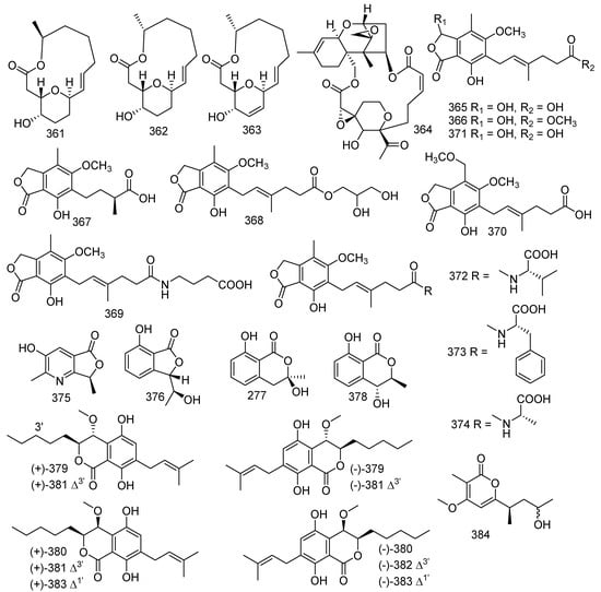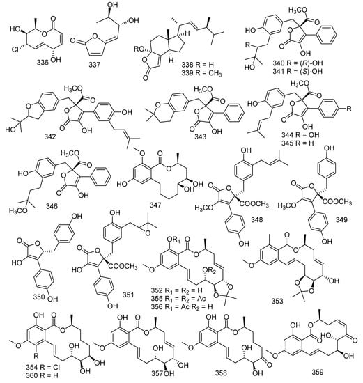 A known ten-membered macrolide named (3Z,5S,6E,8S,9S,10R)-8-chloro-5,8,9,10-tetrahydro-5,9-dihydroxy-10-methyl-2H-oxecin-2-one (336) was obtained from a soft coral-derived fungus Lophiostoma sp. ZJ-2008011 [36]. The bioassay test showed that 336 exhibited antibacterial activities against B. cereus (MIC = 3.12 μM). Aspergillus versicolor LCJ-5-4 yielded a new lactone, marked as versicolactone A (337) [85]. A recent study indicated that sorbicillinoid derivatives from marine-derived fungus also possessed radical scavenging activities. In the last four years, 69 new sorbicillinoids were identified from fungi [155,156]. Dimethyl incisterol A3 (338) and (l7R)-17-methylincisterol (339) were obtained from a soft coral-derived fungus Talaromyces sp. SCSIO 041201. Both 338 and 339 showed antifouling activities to Bugula neritina larva, with LC50 values of 3.13 and 4.15 μg/mL, respectively [141]. Four new butanolide derivatives 8’’R,9’’-diolversicolactone B (340), 8’’S,9’’-diolversicolactone (341), 3’-isoamylene butyrolactone IV (342), and 4’-dehydroxy aspernolide A (343), together with two described compounds named butyrolactone I (344) and versicolactone B (345), were produced by a coral-associated fungus Aspergillus terreus. They were tested for the inhibition of NO production in RAW264.7 mouse macrophages induced by LPS at a concentration of 20 μM (positive control group indomethacin of 50 μM). The inhibitory effect of compound 345 was significantly stronger than that of indomethacin. In addition, compounds 342 and 344 also displayed a modest inhibitory effect on NO production with inhibition ratios of nearly 25.1% and 25.3%, respectively [157]. A new compound named versicolactone G (346) was isolated from a coral-associated fungus Aspergillus terreus, which showed remarkable anti-inflammatory activity against NO production (IC50 = 15.72 μM). Other studies indicated that butyrolactone I (344) presented with antitumor activity against HL-60 with an IC50 value of 13.22 μM and ameliorated AlCl3-induced cognitive deficits in zebrafish in a dose-dependent manner [24,158,159]. (5S,6S)-dihydroxylasiodiplodin (347) was produced by the fungus Pseudallescheria ellipsoidea F42-3 derived from the soft coral Lobophytum crissum [51]. Four described metabolites, 2-O-Methylbutyrolactone I (348), 2-O-Methylbutyrolactone II (349), demethoxycarbonylbutyrolactone II (350), and butyrolactone III (351), were obtained from fungus Aspergillus sp. Compounds 349–351 showed inhibition against the settlement of barnacle Balanus amphitrite with EC50 values of 2.10, 4.25, and 2.89 µg/mL, respectively. Furthermore, compounds 348 and 349 as well exhibited outstanding antibacterial activities toward S. aureus, S. epidermidis, and B. cereus, V. parahaemolyticus, and V. anguillarum with MIC values ranging from 1.56 to 12.5 µM [160]. Three novel metabolites, cochliomycins A-C (352–354), along with six known analogues, diacetyl derivative (355), monoacetyl derivative (356), zeaenol (357), LL-Z1640-1 (358), LL-Z1640-2 (359), and paecilomycin F (360), were isolated from the fungus Cochliobolus lunatus from the gorgonian Dichotella gemmacea. In addition, compounds 353, 355–358, and 360 exhibited antifouling activity against the larval settlement of the barnacle Balanus amphitrite with EC50 values of 1.2, 15.4, 12.5, 5.0, 5.3, and 17.9 µg/mL, respectively. Moreover, compound 359 showed inhibition to HgCl2-induced JNK phosphorylation at 5–100 ng/mL [161,162]. The chemical exploration of Aspergillus sp. SCSGAF 0076 led to the isolation of three novel compounds, aspergillides A-C (361–363). Furthermore, compound 363 exerted considerable antifouling activity against Bugula neritina larvae settlement with LC50/EC50 > 25 [101,163,164]. A known metabolite satratoxin F (364) was discovered from the soft coral-derived fungus Stachybotrys chartarum SCSIO41201, and 364 showed weak inhibitory activity against MRSA ATCC 29213 with the MIC value of 39 µg/mL. Furthermore, compound 364 displayed excellent cytotoxic activities against five human cancer cell lines (MDA-MB-231, C4-2B, MGC803, MDA-MB-468, and A549) with IC50 values less than 39 nM [81]. Five new mycophenolic acid derivatives, 6-(5-carboxy-3-methylpent-2-enyl)-7-hydroxy-3,5-dimethoxy-4-methylphthalan-1-one (365), 6-(5-methoxycarbonyl-3-methylpent-2-enyl)-3,7-dihydroxy-5-methoxy-4-methylphthalan-1-one (366), 6-(3-carboxybutyl)-7-hydroxy-5-methoxy-4-methylphthalan-1-one (367), 6-(5-(2,3-dihydroxy-1-carboxyglyceride)-3-methylpent-2-enyl)-7-hydroxy-5-methoxy-4-methylphthalan-1-one (368), and 6-(5-(1-carboxy-4-N-carboxylate)-3-methylpent-2-enyl)-7-hydroxy-5-methoxy-4-methylphthalan-1-one (369); and five already reported metabolites 8-O-methyl mycophenolic acid (370), 3-hydroxymycophenolic acid (371), N-mycophenoyl-L-valine (372), N-mycophenoyl-L-phenyloalanine (373), and N-mycophenoyl-L-alanine (374) were obtained from the coral-derived fungus Penicillium bialowiezense. Moreover, compounds 365–374 were tested for immune inhibitory activity; and compounds 372, 372 and 366 showed significant inhibition to IMPDH2 with IC50 values ranging from 0.84 to 0.95 µM; while 366–369 and 372–374 revealed notable inhibitory potency with IC50 values ranging from 3.27 to 24.68 µM [165]. A new azaphthalide derivative, (S)-3-hydroxy-2,7-dimethylfuro [3,4-b] pyridin-5(7H)-one (375), and a new phthalide derivative, (S)-7-hydroxy-3-((S)-1-hydroxyethyl) isobenzofuran-1-(3H)-one (376), together with two known compounds (R)-3-hydroxymellein (377) [166] and (3R,4S)-trans-4-hydroxymellein (378) [167], were obtained from the coral-associated fungus Aspergillus sp. SCSIO41405. The isolated compounds were tested for antibacterial and enzyme inhibition activities. Compound 377 revealed weak antibacterial activity against methicillin-resistant Staphylococcus epidermidis, and 378 also exhibited antibacterial activity against E. faecalis, with the same MIC value of 100 μg/mL [1