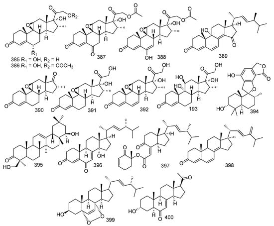 Four new compounds, arthriniumsteroids A−D (385–388), together with a known compound named eoaspergillic acid (389), were obtained from the soft coral-derived fungus Simplicillium lanosoniveum SCSIO41212. All compounds displayed weak inhibitory activities against LPS-induced NO production in RAW 264.7 cells with inhibitory rates ranging from 21.4%−44.6% [170]. Four new steroid derivatives, penicildiones A−D (390–393), together with a described compound, stachybotrylactone B (394), were given by soft coral-derived fungus Penicillium sp. SCSIO41201. Moreover, compound 394 showed evident cytotoxic activity against HL-60, K562, MOLT-4, ACHN, 786-O, and OS-RC-2 cell lines with IC50 values of 5.23, 4.12, 4.31, 23.55, 7.65, and 10.81 μM, respectively [171]. Further investigation of coral-derived fungus Aspergillus sp. led to separation of three known compounds, melilotigenin C (395) [168], 14α-hydroxyergosta-4,7,22-triene-3,6-dione (396) [24], chaxine C (397), and a novel compound, 24,28-didehydro-2 (398) [160]. Melilotigenin C (395) revealed moderate inhibition to pancreatic lipase (IC50 = 15.6 μg/mL) [168]. 396 exhibited outstanding anti-inflammatory activity against NO production (IC50 = 26.83 μM) [24]. In addition, both 397 and 398 showed activities against the larval settlement of barnacle Balanus amphitrite with EC50 values of 2.50 and 18.40 μg/mL, respectively [160]. 5α,8α-epidioxy-ergosta-6,22E-dien-3β-ol (399) was yielded by the gorgonian-derived fungus Xylaria sp. C-2 and displayed bioactivity against E. coli, P. putida, and K. rhizophila with MIC values of 3.13, 1.56, and 6.25 μM, respectively [172]. A novel pregnane, 3α-hydroxy-7-ene-6,20-dione (400) was found from a fungus Cladosporium sp. WZ-2008-0042 and showed significant antiviral activity against RSV (IC50 = 0.12 μM) [173] (Figure 17).