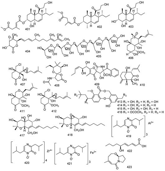 Research on the soft coral-derived fungus Trichoderma harzianum (XS-20090075) led to the isolation of two new natural products, methyl-trichoharzin (401) and trichoharzin B (402), and two known compounds, eujavanicol A (403) and nafuredin (404). Compounds 401, 403, and 404 displayed antifouling activity against larval settlement of Bugula neritina with EC50 values of 29.8, 35.6, and 21.4 μg/mL respectively. Another study showed that eujavanicol A (403) revealed bioactivity against E. coli with a MIC value of 5.0 μg/mL [79,174]. A polysaccharide named AW1 (405) was isolated from the Aspergillus ochraceus collected from coral Dichotella gemmacea. AW1(405) was relatively rarely found in the marine metabolites. AW1 (405) is an extracellular polysaccharide that possesses a novel galactomannan and the molecular weight was 29 kDa [175]. Three new compounds (406–408), together with four known analogues named pseurotin A (409), AM6898B (410), and (−)-ovalicin derivative (411), chlovalicin (412), were obtained from the fungus Pseudallescheria boydii collected from the South China Sea soft coral Sinularia sandensis. Compound 409 increased the number of osteoclasts at 0.1 μM, while compound 407 decreased the numbers of osteoclasts at 1 μM; and compounds 410 and 411 increased the number of osteoclasts at both 0.1 and 1 μM. In contrast, compound 412 significantly decreased the number and reduced the area of the osteoclasts at both 0.1 and 1 μM. Pseurotin A (409) was active against the phytopathogenic bacteria Erwinia carotovora and Pseudomonas syringae with IC50 values of 220 and 112 μg/mL, respectively. It was still active against B. cereus and Shigella shiga with an MIC of 64 μg/mL. Meanwhile, it also inhibited the production of IgE with an IC50 value of 3.6 μM [176,177,178,179]. Penicillium pinophilum XS-20090E18 was the source of a new metabolite, along with three previously described compounds, hydroxypenicillide (413), penicillide (414), isopenicillide (415), and purpactin A (416). Meanwhile, all of them displayed antifouling activity against the settlement of the barnacle Balanus amphitrite with EC50 values of 6.0, 2.6, 20, and 10 μg/mL, respectively. Penicillide (414) was also regarded as a calcium-activated papain-like protease with an IC50 value of 7.1 μM. Purpactin A (416) was considered as an inhibitor of TMEM16A chloride channels and mucin secretion in airway epithelial cells with an approximate IC50 value of 2 μM; and displayed moderate inhibition against MCF7, H460, and SF268 with IC50 values of 20.5, 17.6, and 21.9 μM, respectively [103,180,181,182]. A novel hexahydrobenzopyran derivative, cytosporin L (417) and a bioactive compound, cytosporin D (418), were isolated from a fungus Eutypella sp.; and both of them exerted considerable inhibition against RSV with the IC50 values of 72.01 and 30.25 μM, respectively. Furthermore, compound 417 revealed bioactivity to Micrococcus lysodeikticus and Enterobacter aerogenes with the same MIC value of 3.12 μM. Cytosporin D (418) presented antimicrobial activity against E. coli and S. aureus. [183,184]. Two new metabolites together with a known toxin, aluminiumneoaspergillin (419), zirconiumneoaspergillin (420) and ferrineoaspergillin (421), were isolated from Aspergillus sp. SCSGAF0093. All of them exhibited lethality against brine shrimp (Artemia salina) with LC50 values of 6.61, 10.76, and 29.62 μM, respectively [77]. A new fatty acid, (2E,4E,6S)-6-hydroxydeca-2,4-dienoic acid (422), was produced by the gorgonian-associated fungus Xylaria sp. C-2 [172]. Cladosporilactam A (423), a new bicyclic lactam, was isolated from a gorgonian-derived Cladosporium sp. fungus and exhibited potent anticancer activity against HeLa with an IC50 value of 0.76 µM [185] (Figure 18).