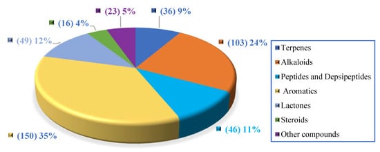 Generally, marine natural products isolated from coral-associated fungi are dominated by aromatics (35%) and alkaloids (24%), followed by lactones, peptides, terpenes, steroids, and other compounds (Figure 19, Table S6).