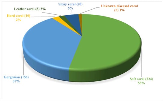 These natural compounds were isolated from several coral-derived fungi covered soft coral, gorgonian coral, hard coral, leather coral, stony coral, and some unknown ones. Among them, soft coral-derived fungi are the dominant producers of natural products, comprising more than 53% of total molecules. And the second, gorgonian-derived fungi, accounts for 37% (Figure 20, Table S7). Generally, the epizoic relationship between symbiotic or epiphytic fungi and their host animals or environment induces the production of metabolites.