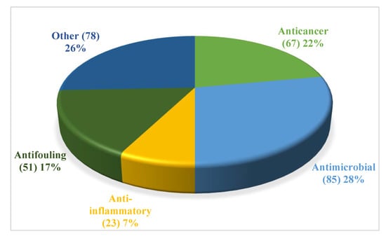 Bioactive compounds are comprised of anticancer (22%), antimicrobial (28%), anti-fouling (17%), anti-inflammatory (7%), and other biological activities (26%) (Figure 21, Table S1–S5). Among them, other activities include neuroprotective activity, AChE inhibitory activity, α-glucosidase activity etc. It follows that compound produced by coral-associated fungi reveal great potential bioactivities.