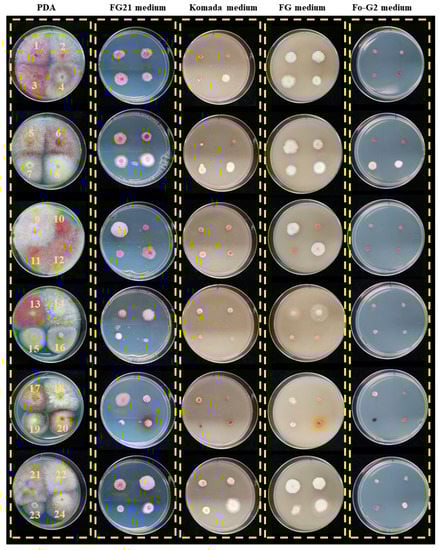 Fungal growth comparison of the FG21 medium and previously developed media. Potato dextrose agar (PDA) is a general medium for fungal culture and is used as the foundation of FG21 medium. Komada [16] and Fo-G2 [17] are Fusarium oxysporum selective media. FG is a Fusarium graminearum-selective medium [20]. The strains were cultured at 25 °C for 4 d. Fusarium graminearum sensu stricto Fg0101020 (1), Fg0201201 (2), Fusarium asiaticum Fa0244004 (3), Fa0239005 (4), Fusarium vorosii Fv0301112 (5), Fv0301831 (6), Fusarium avenaceum MAFF101042 (7), MAFF235547 (8), Fusarium culmorum MAFF101144 (9), NRRL3288 (10), Fusarium cerealis NRRL25805 (11), NRRL13721 (12), Fusarium poae MAFF236500 (13), MAFF236648 (14), Microdochium nivale MAFF235834 (15), MAFF236681 (16), Fusarium sp. F1904008 (17), Pestalotiopsis sp. P1904014 (18), Alternaria sp. A1904015. (19), Epicoccum sp. E1904019 (20), Fusarium sporotrichioides MAFF236638 (21), MAFF236639 (22), Fusarium fujikuroi Gfc0801001 (23), and Gfc0825009 (24).