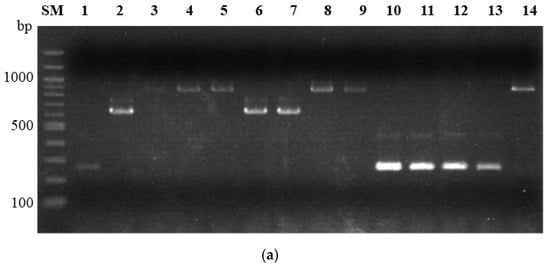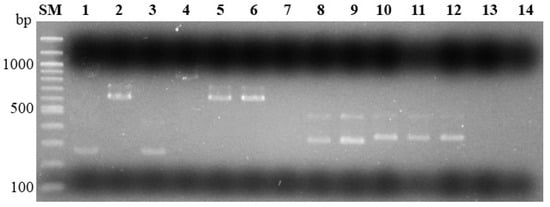Multiplex PCR for species identification and trichothecene typing of the Fusarium graminearum species complex. Multiplex PCR with the primers 3CON, 3D3A, 3D15A, and 3NA for trichothecene typing. Expected amplicon sizes were 3-acetyl deoxynivalenol (3ADON): 243 bp; 15-acetyl deoxynivalenol (15ADON): 610 bp; and nivalenol (NIV): 840 bp. Multiplex PCR with primers HS974, HS976, HS1035, and HS1039 for species identification. Expected amplicon sizes for Fusarium graminearum sensu stricto (s. str.): 317 bp; Fusarium asiaticum: 332 bp. PCR amplicons were subjected to 1% agarose gel electrophoresis. Lane SM, 100 bp-size marker; lanes 1 to 7, multiplex PCR for trichothecene typing (lane 1, Fg0101020/3ADON; lane 2, Fg0201201/15ADON; lane 3, Fa0244004/3ADON; lane 4, Fa0239005/NIV; lane 5, Fa0343747/15ADON; lane 6, Fv0301112/15ADON; lane 7, water control); lanes 8 to 14, multiplex PCR for species identification (lane 8, Fg0101020/F. graminearum s. str.; lane 9, Fg0201201/F. graminearum s. str.; lane 10, Fa0244004/F. asiaticum; lane 11, Fa0239005/F. asiaticum; lane 12, Fa0343747/F. asiaticum; lane 13, Fv0301112/Fusarium vorosii; lane 14, water control).