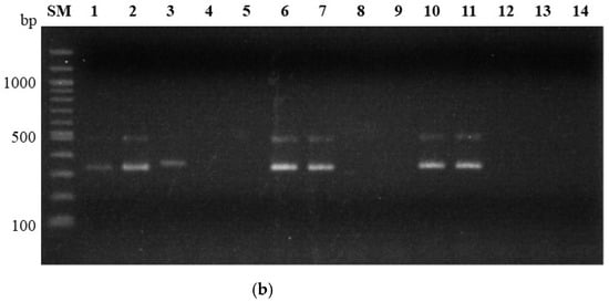 Multiplex PCR for trichothecene typing and species identification of Fusarium spp. Multiplex PCR with primers, 3CON, 3D3A, 3D15A, and 3NA for trichothecene typing (a). Expected amplicon size for 3-acetyl deoxynivalenol (3ADON): 243 bp; 15-acetyl deoxynivalenol (15ADON): 610 bp; nivalenol (NIV): 840 bp. Multiplex PCR with primers HS974, HS976, HS1035, and HS1039 for species identification (b). Expected amplicon size for Fusarium graminearum sensu stricto (s. str.): 317 bp; Fusarium asiaticum: 332 bp. PCR amplicons were subjected to 1% agarose gel electrophoresis. Lane SM, 100 bp size marker; lane 1, Fg0101020 (F. graminearum s. str./3ADON); lane 2, Fg0201201 (F. graminearum s. str./15ADON); lane 3, Fa0239005 (F. asiaticum/NIV); lane 4, NRRL26755 (Fusarium acaciae-mearnsii/unknown); lane 5, NRRL34207 (F. acaciae-mearnsii/unknown); lane 6, NRRL26916 (Fusarium boothii/15ADON); lane 7, NRRL29105 (F. boothii/15ADON); lane 8, NRRL29010 (Fusarium meridonale/NIV); lane 9, NRRL28721 (F. meridonale/NIV); lane 10, NRRL3288 (Fusarium culmorum/3ADON); lane 11, NRRL25475 (F. culmorum/3ADON); lane 12, NRRL28062 (Fusarium pseudograminearum/3ADON); lane 13, NRRL28334 (F. pseudograminearum/unknown); lane 14, NRRL13393 (Fusarium lunulosporum/NIV).