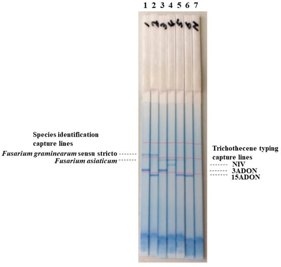 A dipstick DNA chromatography assay was performed using a mixture of multiplex PCR for species identification and trichothecene typing. The tested PCR mixtures included all Fg complex members and trichothecene types that have been detected in Japan. The PCR amplicons used for trichothecene typing were designed to be bound on the lower three lines, and PCR amplicons for species identification were designed to be bound on the two upper lines of the dipstick (Figure 4). In all the strains tested, positive lines appeared 20 min after chromatography development (Figure 4).