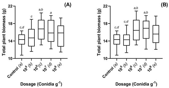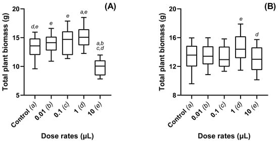 Total plant biomass (g) of Oilseed rape plants treated with different dosages of the Metarhizium brunneum-derived VOCs: (A) 1-octen-3-ol and (B) 3-octanone. Whole plant fresh weights recorded for OSR exposed to different concentrations of 1-octen-3-ol and 3-octanone. Dosage rates are represented as µL per 100 g dry compost. Plants were grown in a glasshouse maintained at 25 ± 2 °C for a total of six weeks. Controls were exposed to compost media without additional treatment. Figure display’s minimum, 1st quartile, median, 3rd quartile and maximum measurements within the treatment group. Significant results denoted between treatments using letters (a–e) above each boxplot; where denotation letters are absent, no significant differences were detected between treatments.