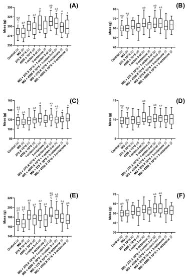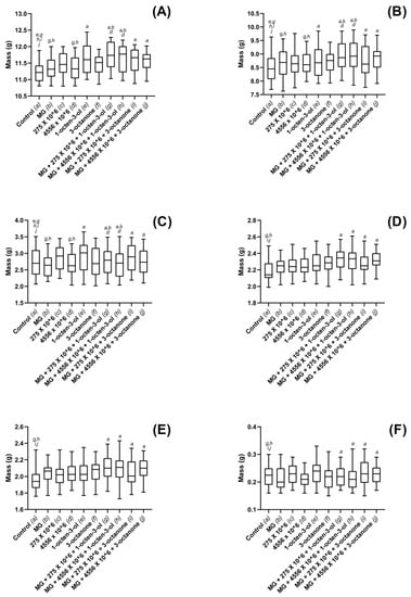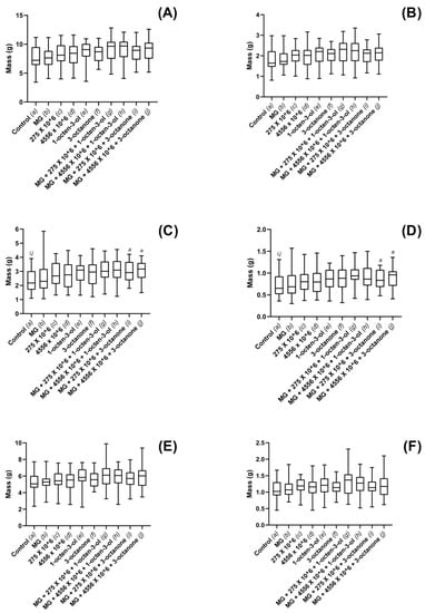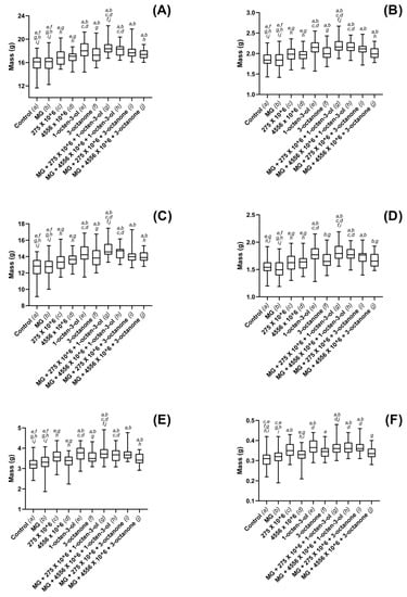 In the case of 3-octanone, no significant differences were found in fresh weight growth as compared to controls (Figure 2B). Mean growth was found to be the highest for doses of 1 µL, which was significantly greater than for doses of 10 µL per 100 g (p = 0.016).