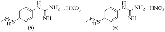 Furthermore, in 2004, the group of Braunerova and coworkers published their work on the synthesis and biological evaluation of structurally simple 4-substituted phenyl guanidinium salts, [14]. A total of twenty one analogs were synthesized, and from these, two molecules were highlighted, (5) and (6), Figure 3. Both compounds displayed comparable activity to the positive control, ketoconazole, against strains of Aspergillus fumigatus and Aspergillus corymbifera, and lower activity against six other fungal species. The group also reported that alternate salt forms (acetate and sorbate), and the free base of (6), were equipotent with the originally synthesized nitrate salt. It is encouraging that the two analogs described displayed good potencies, and additional work to expand the data on these derivatives would be welcome, along with the synthesis and evaluation of additional related compounds, such as incorporating additional substitution on the phenyl ring.