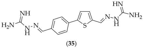 In 2016 Opsenica and coworkers described thiophene-based guanylhydrazones as antifungal agents, [49]. The group synthesized ten guanylhydrazones, and tested them against eight fungal strains. The experiment showed that seven of the derivatives showed appreciable antifungal activity, with the compounds containing two guanidine moieties generally displaying higher antifungal potency. The compound that was selected for further study, due to its higher antifungal activity (MIC values from 0.50 – >250 μg/mL) and lower cytotoxicity value (10 μg/mL), was (35), Figure 21. Compound (35) was evaluated in a time-kill experiment, which showed that at 12 h of incubation there was a pronounced fungistatic effect on Candida albicans. The derivative was next tested for its effect on Candida albicans membranes using a concavaline/propidium iodide (PI)/4′,6-diamidino-2-phenylindole (DAPI) cell staining assay. The result of the assay showed that upon treatment with (35), membrane damage and cell death were observed in 20% of the cells, and that the treatment did not induce apoptosis. Compound (35) was also shown to disperse preformed Candida biofilms. The site of action of (35) was interrogated by the effect of the compound on sheep red blood cells, and it was determined that the compound did not act as a membrane disruptor as its primary mechanism. In vivo embryotoxicity was determined using zebrafish, which showed that the compound was less embryotoxic and teratogenic than the azole drug voriconazole. Overall compound (35) looks to be an interesting antifungal agent. The information that the compound is not a membrane disruptor is useful, but it would be more valuable to be able to understand how the compound exerts its effect.
