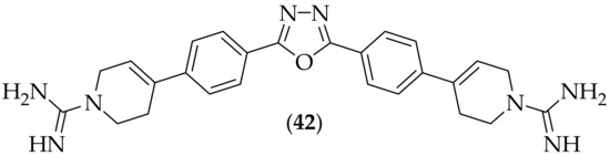 Our group have continued research upon small molecule host-defense peptide mimetics (smHDPM) as antifungal agents [62,63], aiming to recapitulate the effects of host defense peptides, but with a small molecule. Our published paper in 2019, [64], described five different compounds from our labs, which were tested for their antibacterial and antifungal activity. Of the five analogs, the bis-guanidine containing oxadiazole analog, (42), Figure 27, was of most interest due to its antifungal potency. Compound (42) bears some similarity to compound (7), which was published by Sinha et al. [18]. (42) was shown to have potent activity against strains of Candida albicans, Aspergillus fumigatus, and Aspergillus flavus (all MIC: 0.39 μg/mL. This compound was also found to have low CC50 values of 124 μM (3T3 cells), and 151 μM (HepG2 cells).