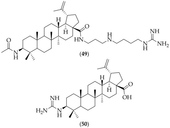 - Spivak, A.Y.; Khalitova, R.R.; Nedopekina, D.A.; Gubaidullin, R.R. Antimicrobial properties of amine-and guanidine-functionalized derivatives of betulinic, ursolic and oleanolic acids: Synthesis and structure/activity evaluation. Steroids 2020, 154, 108530–108559. [Google Scholar] [CrossRef]