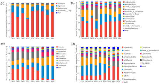Taxonomic profiles of fungal community composition at the phylum level (a) and the class level (b) and bacterial community composition at the phylum level (c) and the class level (d) in different soil layers (0–10 cm, 10–20 cm, and 20–30 cm) under different restoration methods. Shown are group accounting for >1% of the relative abundance, while groups accounting for <1% are integrated into ‘others’. CK, natural recovery; AF, Medicago sativa L sowing; and SB, Bromus inermis Leyss sowing.