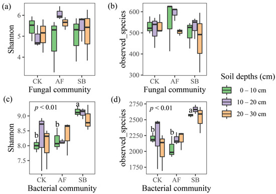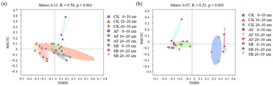 There was no significant effect on the alpha diversity of the fungal community in the sowing treatment (Figure 2a,b; p < 0.01), but the SB treatment significantly increased the bacterial alpha diversity in the soil’s surface layer (Figure 2c,d; p < 0.01). The fungal and bacteria composition was further analyzed with NMDS at the OTU level. The results of NMDS showed that the soil’s fungal communities at the depth of 0–10 cm in the AF treatment were different from the other treatments (Figure 3a; stress = 0.13, p = 0.001) and the soil’s bacterial communities in the SB treatment was significantly altered (Figure 3b; stress = 0.07, p = 0.001).