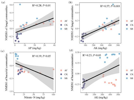 Relationship between environmental variables and community structure of bacteria and fungi. Regression analysis of AP (a) and AK (b) and NMDS of fungal communities. Regression analysis of Nitrate-N (c) and AK (d) and NMDS of bacterrial communities. AP: available phosphorus; AK: available potassium; Nitrate-N: nitrate nitrogen; grey area represents the 95% confidence interval of the linear regression.