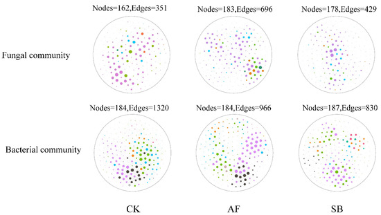 Our results disclosed that the network properties varied throughout the vegetation restoration process. Both the AF and SB treatment increase the complexity of the fungal communities, especially the AF, while the edge numbers and linkage density of the bacterial community was reduced under the two different vegetation restoration methods (Figure 5 and Table 2). A study of vegetation restoration in southwest China in the karst region has shown that the proportion of fungal nodes in the co-occurrence network increased, while the proportion of bacterial nodes showed an opposite trend with the extension of a succession time series [74], which is consistent with our observations. This may indicate that bacteria dominated a pioneer taxon before the restoration and, as the soil’s nutrients increased, the competition of fungi, which had acquired enough organic matter, also increased [74].