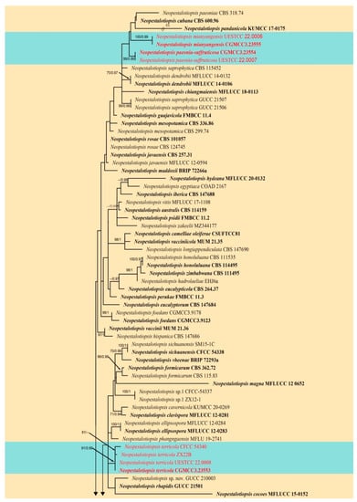 The first combined ITS, tub2, and tef1-α sequence dataset was analyzed to infer the interspecific relationships within Neopestalotiopsis. The concatenated data matrix consisted of sequences of 112 isolates, including the outgroup taxon Pestalotiopsis diversiseta (MFLUCC 12-0287). A total of 1826 characters including gaps (502 for ITS, 753 for tub2, and 571 for tef1-α) were included in the alignment. For the Bayesian inference, the HKY + I + G model with invgamma-distributed rate was selected for ITS, GTR + I + G model with invgamma-distributed rate was selected for tub2 and the HKY + G model with gamma-distributed rate was selected for tef1-α. The maximum likelihood tree confirmed a similar tree topology to the Bayesian consensus tree, and the best-scoring ML tree is shown in Figure 2. The novel species Neopestalotiopsis mianyangensis (UESTCC 22.0006) clusters closest to N. cubana (CBS 600.96), N. paeoniae (CBS 318.74), and N. pandanicola (KUMCC 17-0175). Neopestalotiopsis paeonia-suffruticosa forms a separate branch, and it is phylogenetically related to the above four taxa, while our new strains Neopestalotiopsis terricola (CGMCC3.23553, UESTCC 22.0033) group together with previously reported species Neopestalotiopsis sp. (CFCC 54340) and Neopestalotiopsis sp. (ZX22B) in a monophyletic clade.
