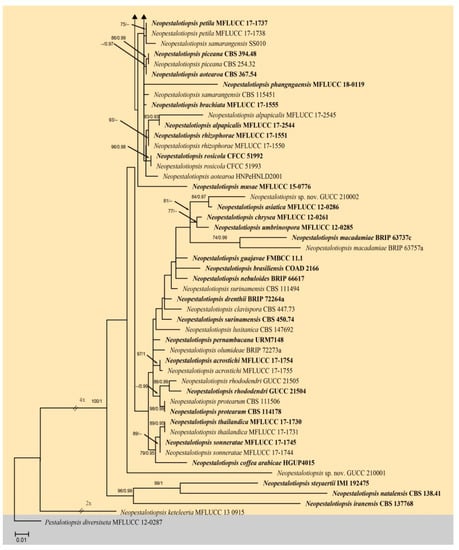 - Maharachchikumbura, S.S.N.; Guo, L.D.; Chukeatirote, E.; Hyde, K.D. Improving the backbone tree for the genus Pestalotiopsis; addition of P. steyaertii and P. magna sp. nov. Mycol. Prog. 2014, 13, 617–624. [Google Scholar] [CrossRef]
