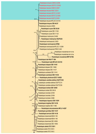 The second combined ITS, tub2, and tef1-α sequence dataset comprised sequences of 139 isolates of Pestalotiopsis including Neopestalotiopsis magna (MFLUCC 12-0652) as the outgroup taxon. A total of 1958 characters including gaps (548 for ITS, 823 for tub2, and 587 for tef1-α) were included in the alignment. For the Bayesian inference, the HKY + I + G model with invgamma-distributed rate was selected for ITS, the GTR + I + G model with invgamma-distributed rate was selected for tub2, and the HKY + G model with gamma-distributed rate was selected for tef1-α. The maximum likelihood tree confirmed the similar tree topology to the Bayesian consensus tree, and the best-scoring ML tree is shown in Figure 3. Seven strains obtained from this study clustered with Pestalotiopsis kenyana (CBS 442.67, LC6633) with moderate bootstrap support (ML 88%, BS 0.99).