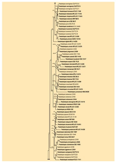 A concatenated dataset of the ITS, LSU, tub2, tef1-α, and rpb2 sequences were used for phylogenetic analyses of the genus Seiridium; ITS, tef1-α, and tub2 for Neopestalotiopsis and Pestalotiopsis. The dataset of Neopestalotiopsis consisted of 112 isolates (Pestalotiopsis diversiseta MFLUCC 12-0287 as outgroup taxon), 139 isolates for Pestalotiopsis (Neopestalotiopsis magna MFLUCC 12-0652 as outgroup taxon) and 52 isolates for Seiridium (Neopestalotiopsis protearum CBS 114,178 as outgroup taxon). Sequences were aligned for each gene separately using the MAFFT v.7.110 online program (http://mafft.cbrc.jp/alignment/server/ (accessed on 15 May 2022)) [36] and manually optimized using BioEdit v.7.0.9 [37]. Maximum likelihood (ML), maximum parsimony (MP), and Bayesian analyses were carried out following Dissanayake et al. [38]. The evolutionary models of nucleotide substitution were selected independently for each locus using MrModeltest 2.2. The phylogenetic tree was visualized by FigTree v.1.4.2 [39].