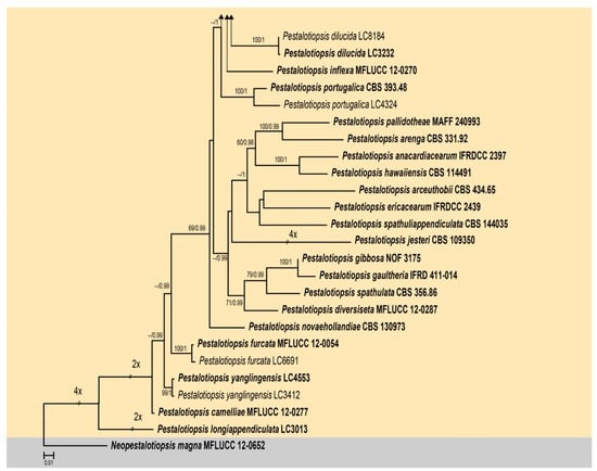 - Maharachchikumbura, S.S.N.; Guo, L.D.; Cai, L.; Chukeatirote, E.; Wu, W.P.; Sun, X.; Crous, P.W.; Bhat, D.J.; McKenzie, E.H.C.; Bahkali, A.H.; et al. A multi-locus backbone tree for Pestalotiopsis, with a polyphasic characterization of 14 new species. Fungal Divers. 2012, 56, 95–129. [Google Scholar] [CrossRef]